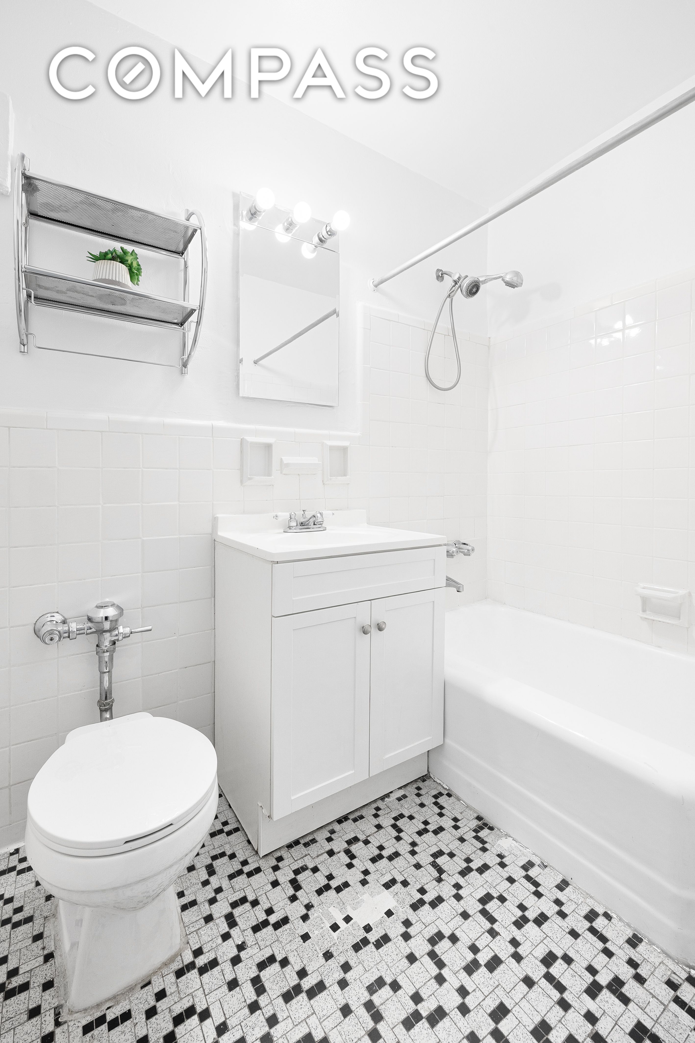 In the kitchen, stainless steel appliances include a GE gas range and a Blomberg refrigerator. The bathroom, with its full tub, reflects the building’s mid-century character: white ceramic wall tiles, original built-in niches for soap and toothbrushes, and even a tilt-out laundry hamper, all tied together with mosaic tile floors in a geometric pattern that never goes out of style. Hardwood floors, central heat, and a Friedrich through-wall air conditioner complete the home.