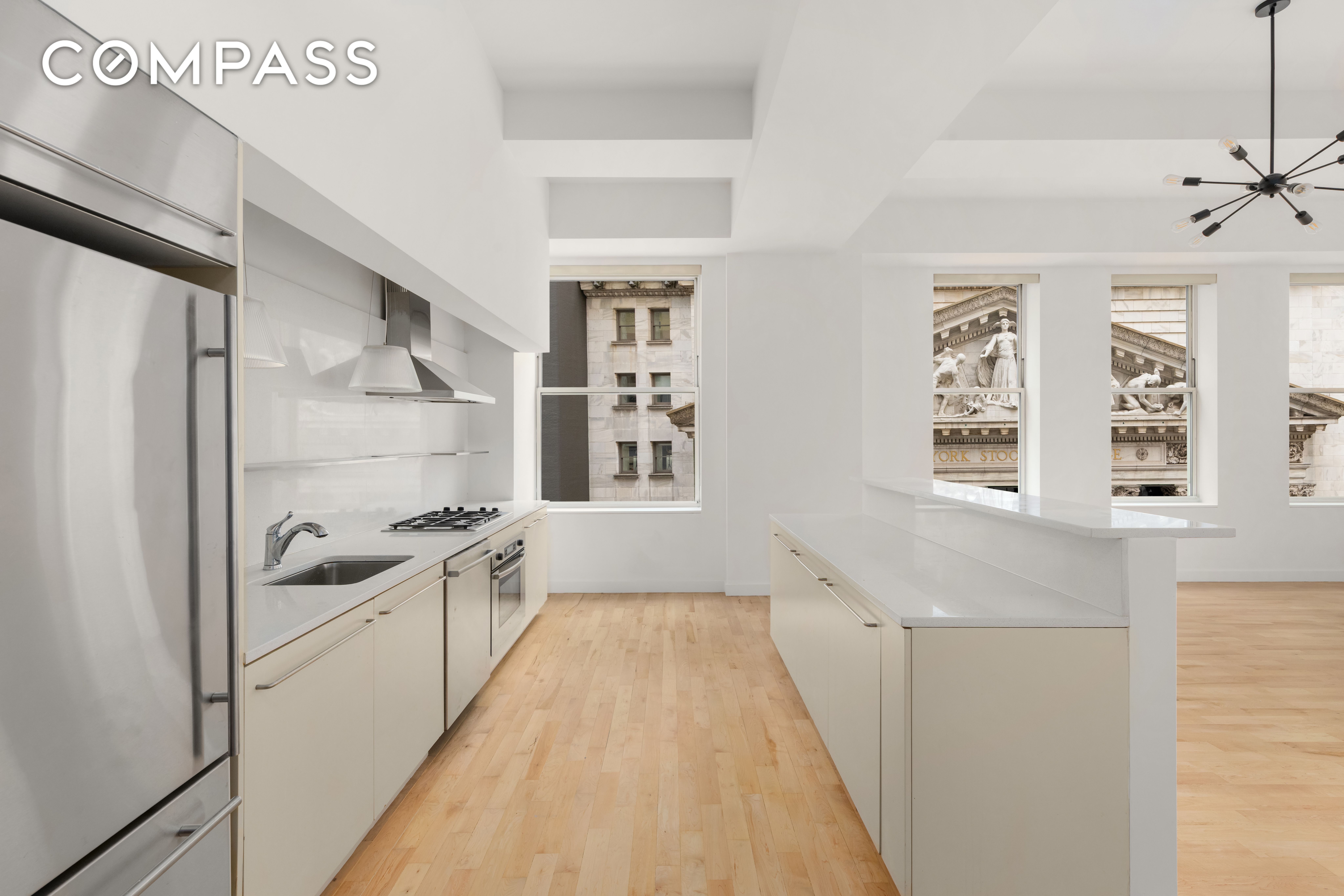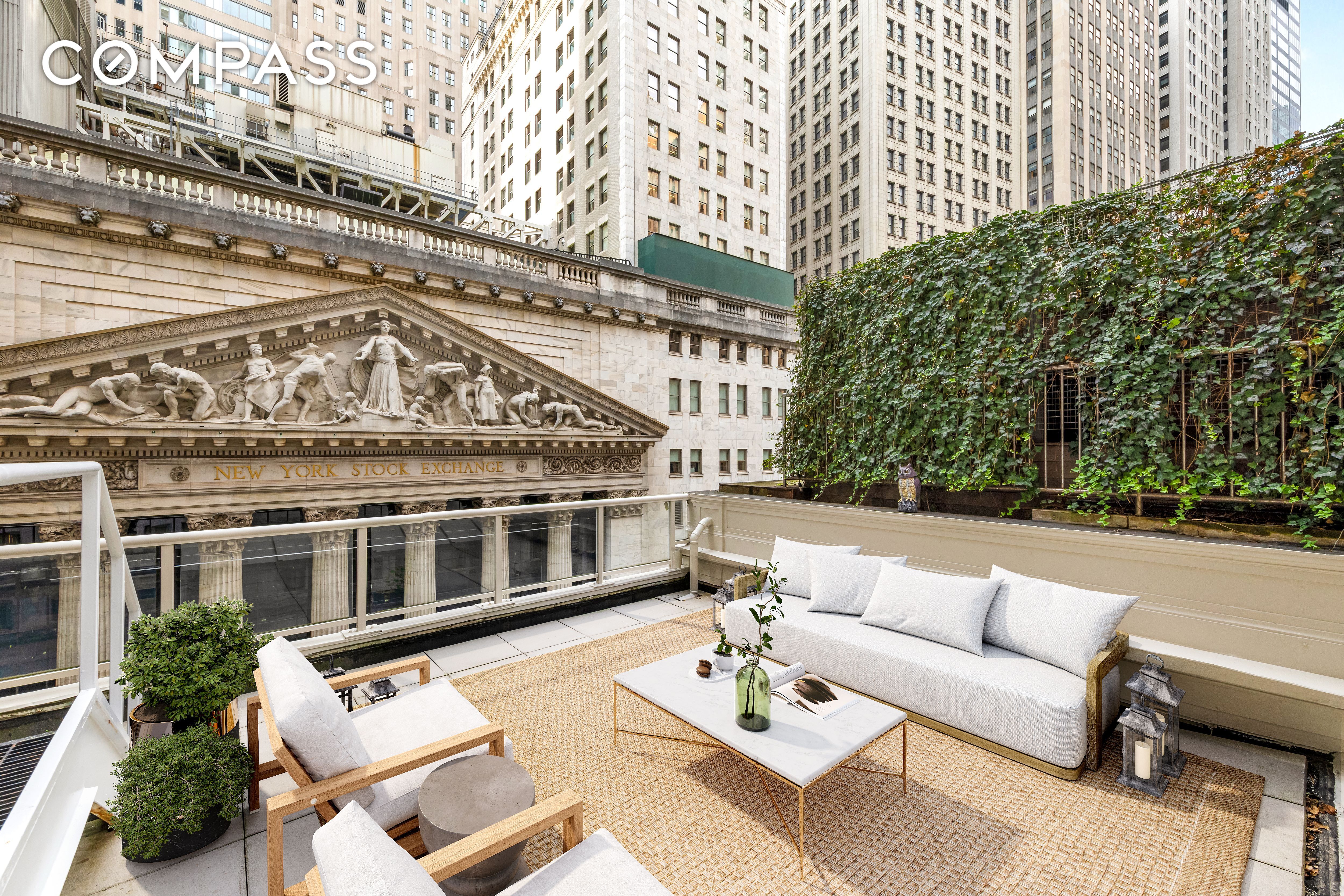 Spanning ~2,200 interior square feet with an additional 400-square-foot private terrace, the home offers soaring 12.5-foot ceilings, oversized windows, and north- and west-facing views that frame the historic New York Stock Exchange building. The loft-like great room opens directly onto the terrace, creating an effortless indoor-outdoor flow perfect for entertaining.