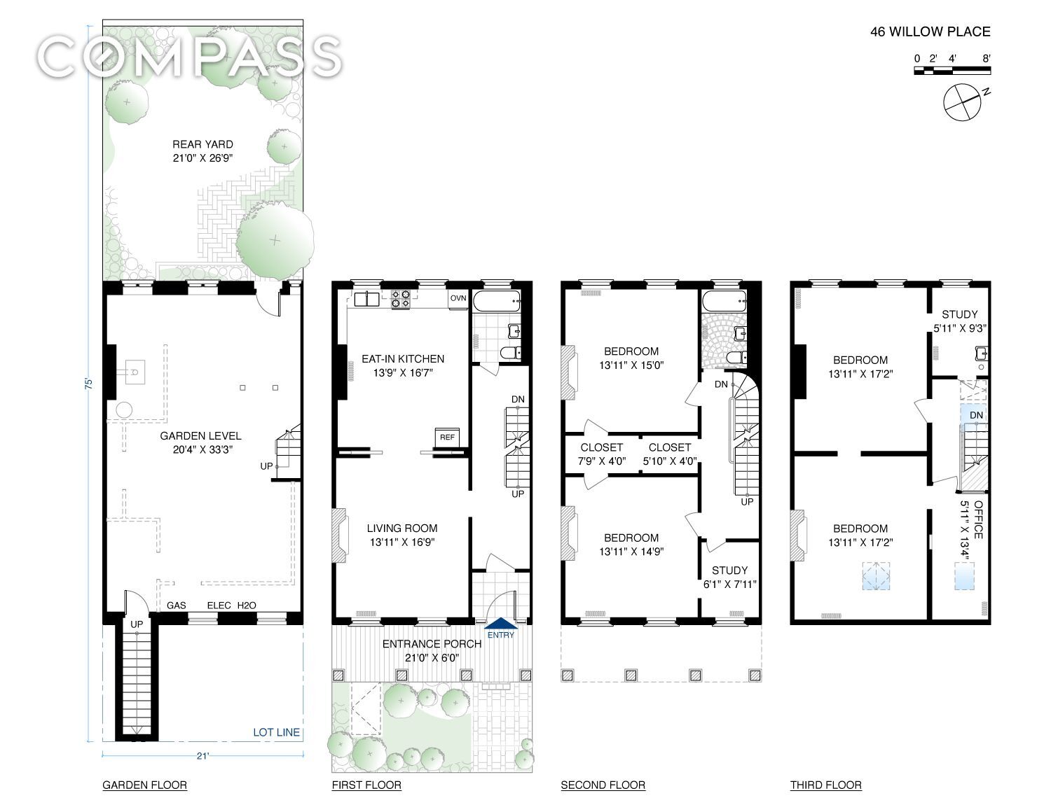 Built in 1849 and owned by the same family since 1969, 46 Willow Place presents a rare opportunity to restore or reimagine an iconic 21-foot-wide brick townhouse on a serene low-traffic street just one block long in Brooklyn Heights. The sole survivor of a row of four Greek Revival colonnade townhouses, 46 Willow Place is now framed by two award-winning Modernist houses built in 1965, a contrast which has fascinated architectural observers. Across the street four colonnaded houses show how the row would have looked originally. In “An Architectural Guidebook to Brooklyn,” Francis Morrone references that quartet and writes that “46 Willow Place is a single house of exactly the same design, as though it were originally a part of the row but decided it preferred living on its own and moved across the street.” Coming home to 46 Willow Place, you’ll enter through the house’s original wrought iron gate and front garden to a wide porch with a double-height portico and columns evocative of a bygone era. Inside you will find an elegant procession of spaces, designed with perfect scale and proportion. Many historic details remain, including the original staircase, wide plank floors, and four fireplaces -- including one clad with black Portero marble, which was used in the finest Brooklyn townhouses and in the original Waldorf Astoria Hotel. The parlor floor is graced with ceilings ten feet high and comprises a front parlor, a large eat-in kitchen, and a full windowed bath. Upstairs there are four large bedrooms, three multi-purpose side rooms, two walk-in closets, and another full windowed bath. The garden level, which is hidden from the street, has a stairwell that leads discreetly up to the front yard. In the back, the garden level steps out on the same level as the backyard, which allows for an array of architectural design options. You’ll find that the spacious backyard, which is currently festooned with ivy, gets great light. It is a perfect place to put your green thumb to good use or simply to relax, entertain and enjoy everyday life. Known as Willowtown to those lucky enough to have lived on Willow Place over the past 175 years, this quiet enclave is a refuge from the bustle of the city. While the street fair each spring may make you feel like you’re living in a small town, the acclaimed restaurants, shops and other amenities of Brooklyn Heights and Cobble Hill are all close by. These include the River Deli, Colonie, Chez Moi, Hibino, Henry Public, the Long Island Bar, and many others. Trader Joe's, Sahadi's, and DellaPietra's are also nearby. Brooklyn Bridge Park is practically at your doorstep, offering everything from pickleball to sunset yoga. The 2/3, 4/5, F, G, R, and A/C subway stations and the NYC Ferry at Pier 6 are within close range for a quick commute to Manhattan and the rest of the city. While this rare historic gem is on the market, feel free to bring your contractor and architect as you consider the possibilities for an uncommon residence.