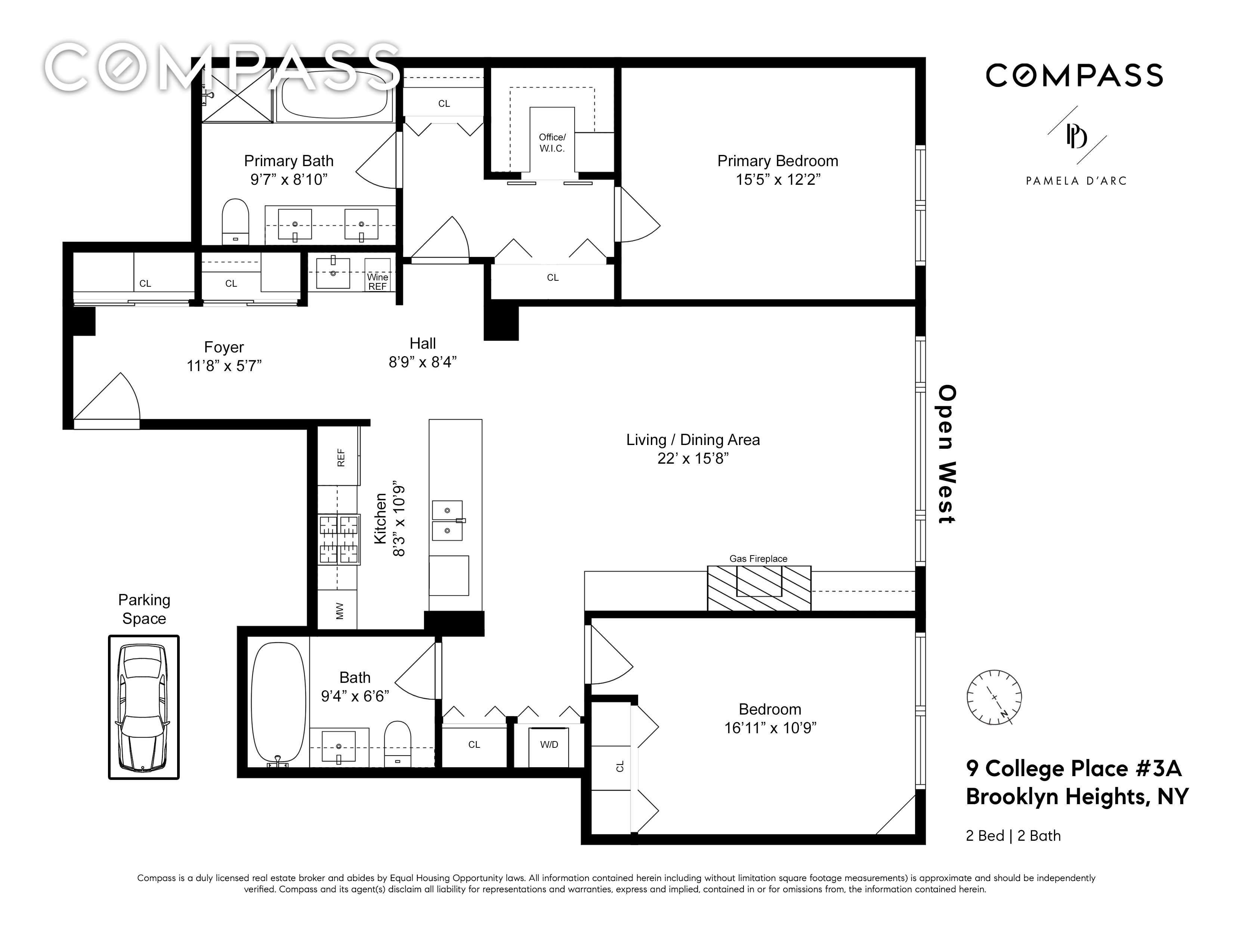 A rarity in the heart of Brooklyn Heights! This excellent condition 2 bedroom/2 bath, 1,433 sqft doorman condominium comes with a dedicated parking space and is perfectly situated on a quiet cul-de-sac in charming Love Lane Mews. The open western exposure floods every room with amazing light, and combined with high ceilings, oversized windows, gas fireplace, central air, hardwood floors and a washer/dryer- this home has it all. The entry foyer, lined with custom floor-to-ceiling closets, leads to an expansive living/dining room with 11’ ceilings, open western exposure that showcases a mature dogwood tree, oversized windows, and a gas fireplace flanked by attractive built-ins. On the near end is a substantial dining space that easily accommodates a large table and a pretty quartz counter with seating for 5. The open chef's kitchen is outfitted with stainless Viking appliances, such as a 6 burner cooktop, oven, french door refrigerator, Bosch dishwasher and deep stainless sink with disposal. Across from the kitchen is a wet bar with a 30 bottle wine fridge, Kohler sink, and copious amounts of storage. The spacious primary suite has charming western views overlooking lovely carriage houses and has an efficient and comfortable home office space, also outfitted with clothes storage. Two generously sized outfitted closets and a luxurious en-suite marble bath with dual vanities, soaking tub with hand-held, glass-enclosed rain shower, and plenty of storage, complete this area. On the other side of the entertaining space is the light-filled second bedroom, hall bath, Bosch washer/dryer, and a large storage closet. Additional storage is hidden throughout. The Love Lane Mews is a full service, pet friendly condominium with a 24-hour doorman, live-in resident manager, gym, bike storage, and an attended garage. Close by is Brooklyn Bridge Park, as well as the 2/3 at Clark Street, 4/5/R at Borough Hall/Court Street, and the A/C at High Street. Local favorites include L’Appartment 4F, Montague Diner, Fini Patio Bar, Clark’s and Ingas Bar. 1% flip tax paid by buyer.