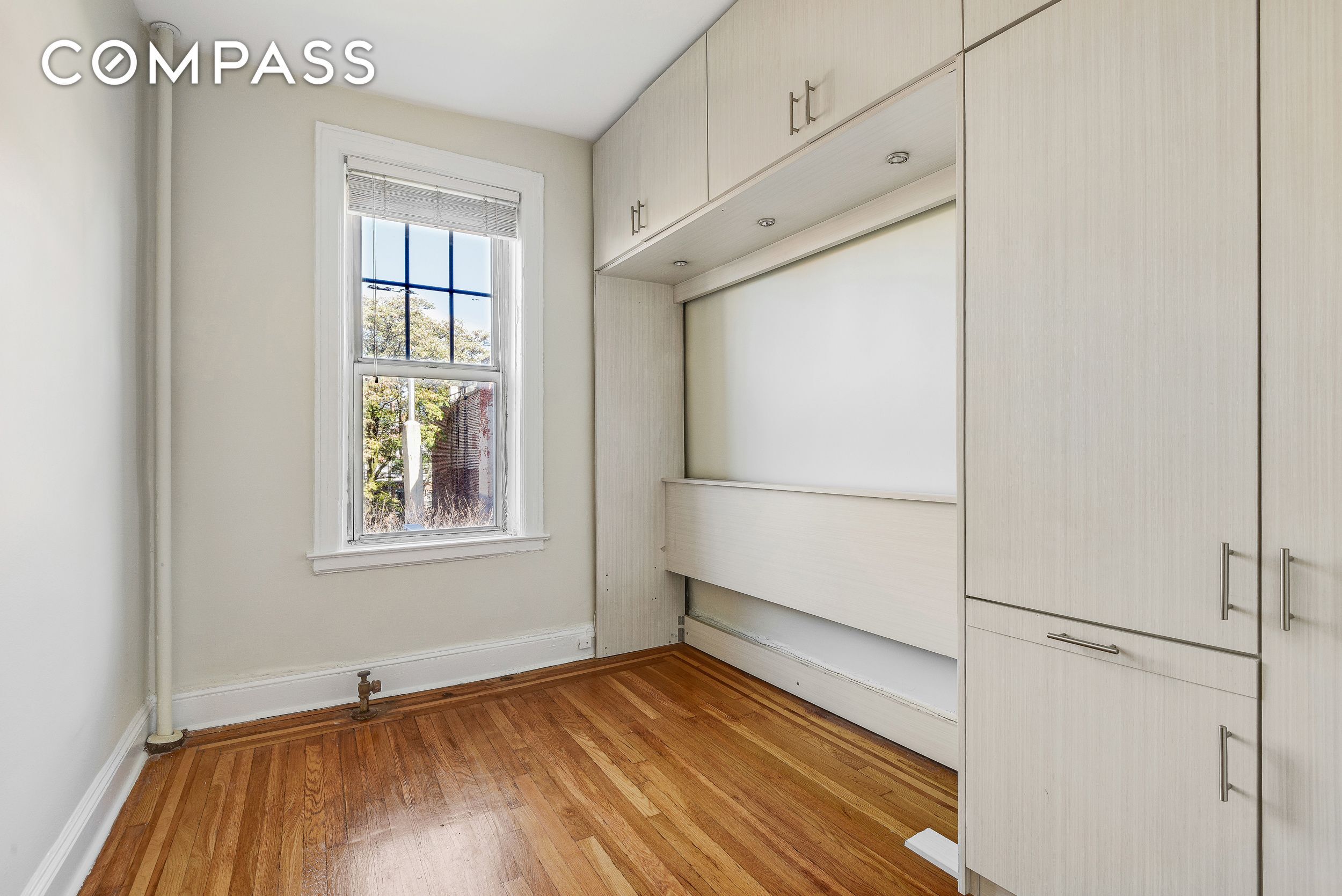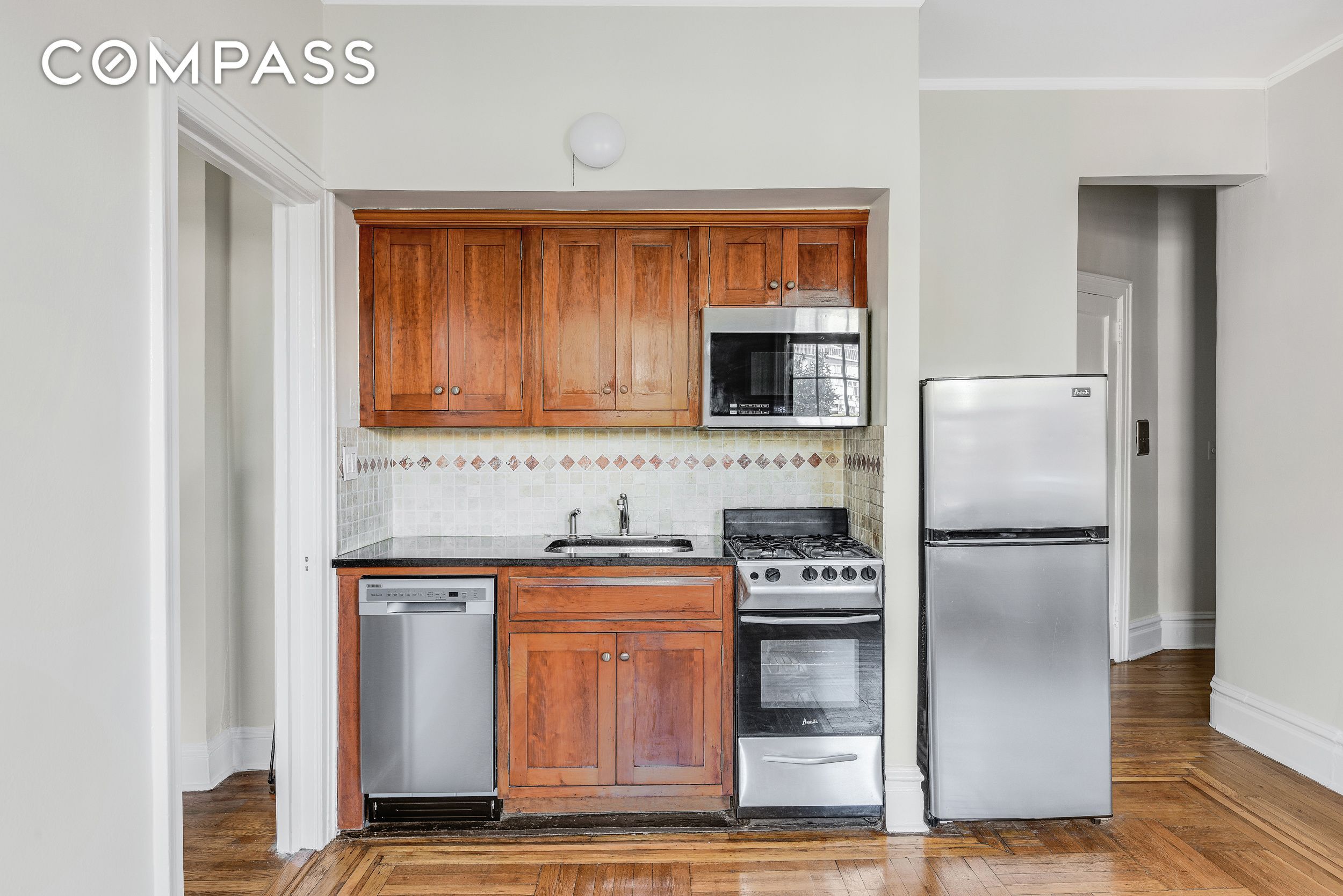 The open kitchen integrates seamlessly with the living area, offering granite countertops, stainless steel appliances, and a full-size refrigerator—ideal for everyday living or entertaining. The bedroom comfortably fits a king-size bed and features custom built-in closets with abundant storage, with a window overlooking tree-lined village streets. A windowed bathroom finished with subway tile completes the home.