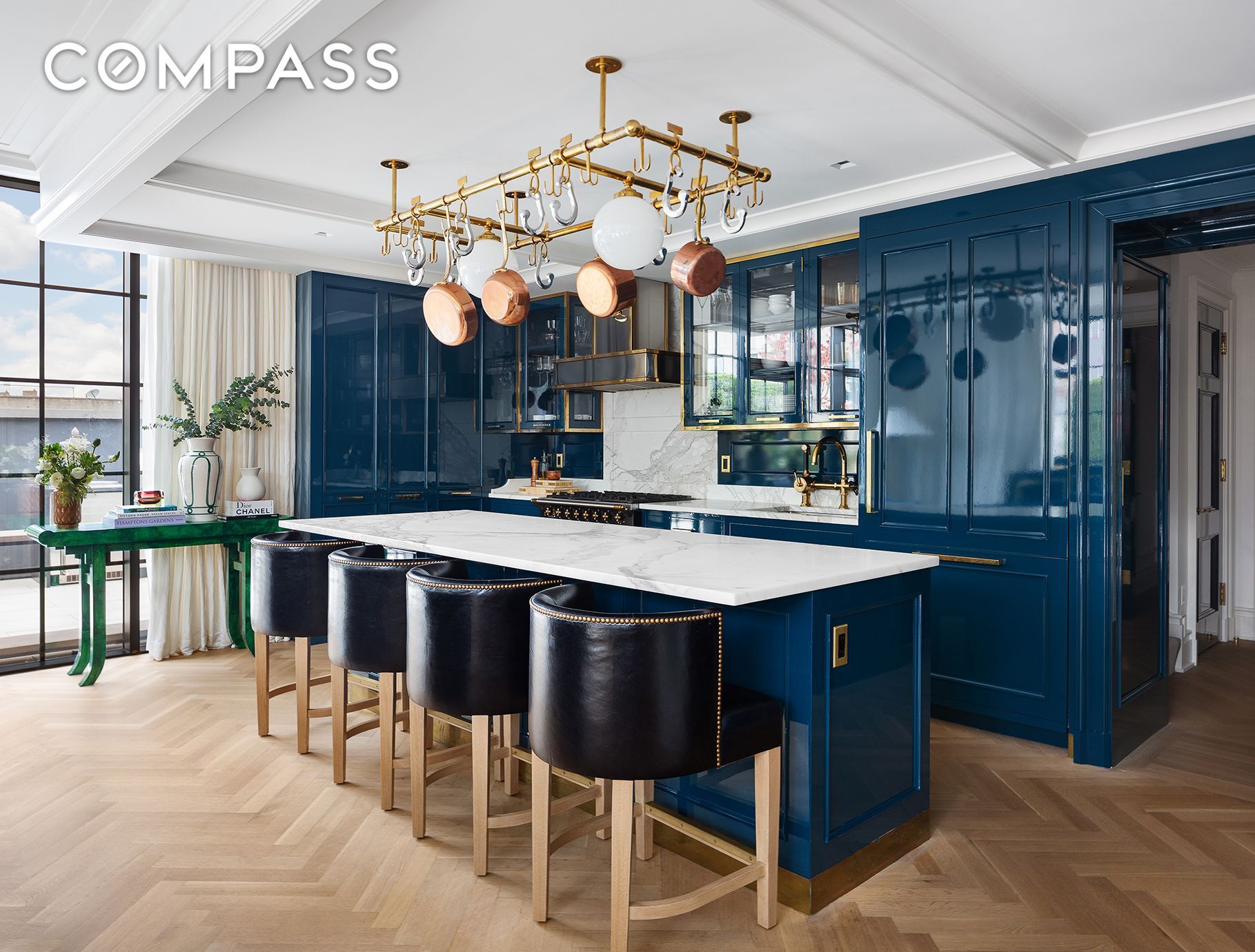 The sprawling great room, wrapped in floor-to-ceiling glass, is ideal for entertaining with seamless access to a spectacular 2,500 sq. ft. landscaped terrace designed by Gunn Landscape Architecture. The custom lacquered kitchen, finished in rich Aegean blue with bronze accents and Calacatta marble, is as functional as it is striking.