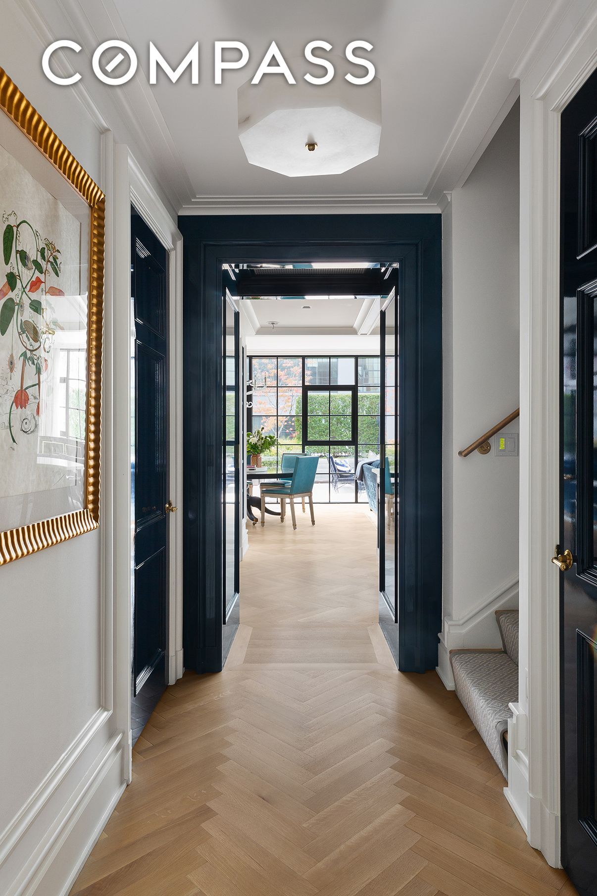The home’s transformation showcases exquisite materials and thoughtful details, from white oak herringbone floors and lacquered glass-trim pocket doors to brass fixtures, French-inspired moldings, and graceful archways.
