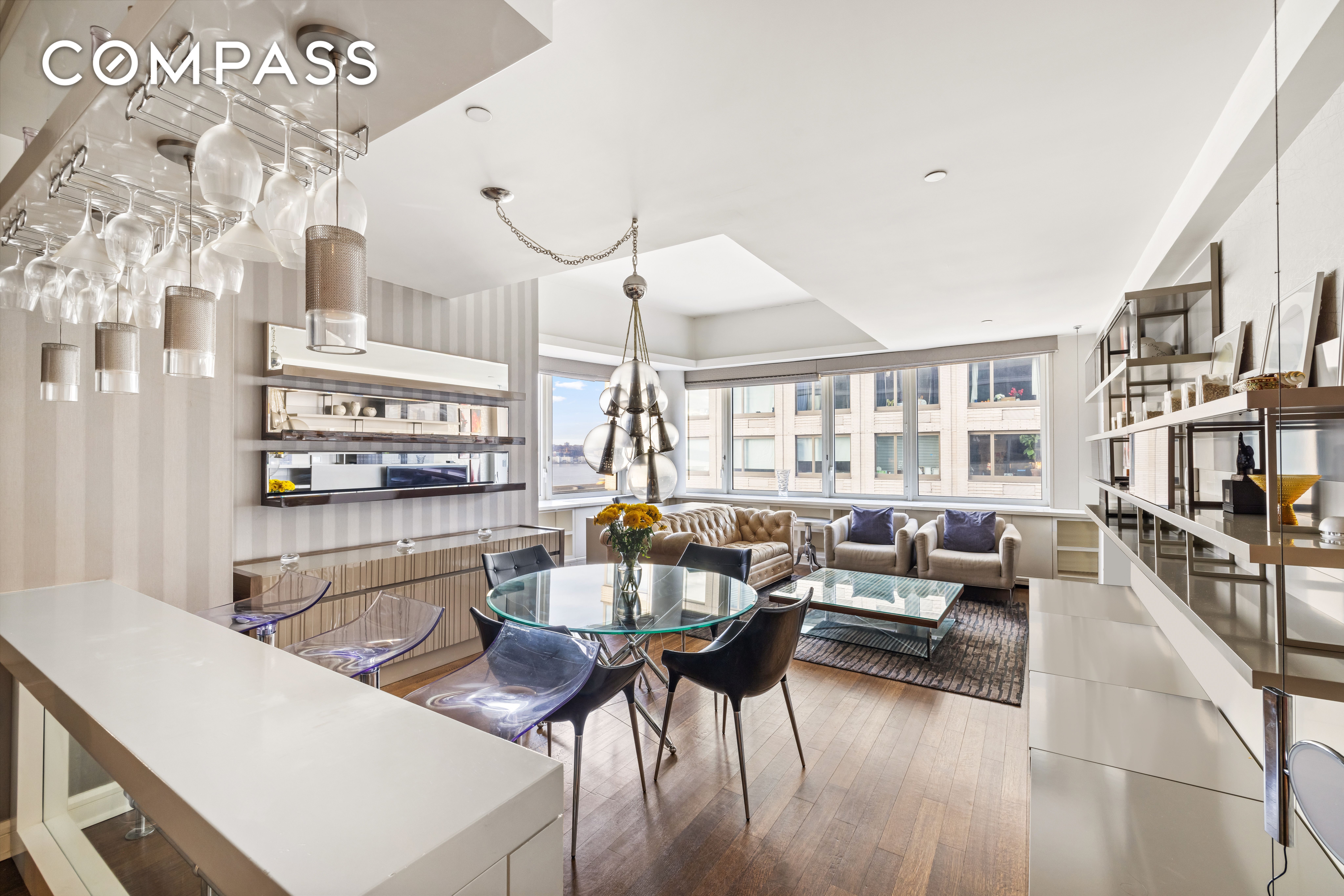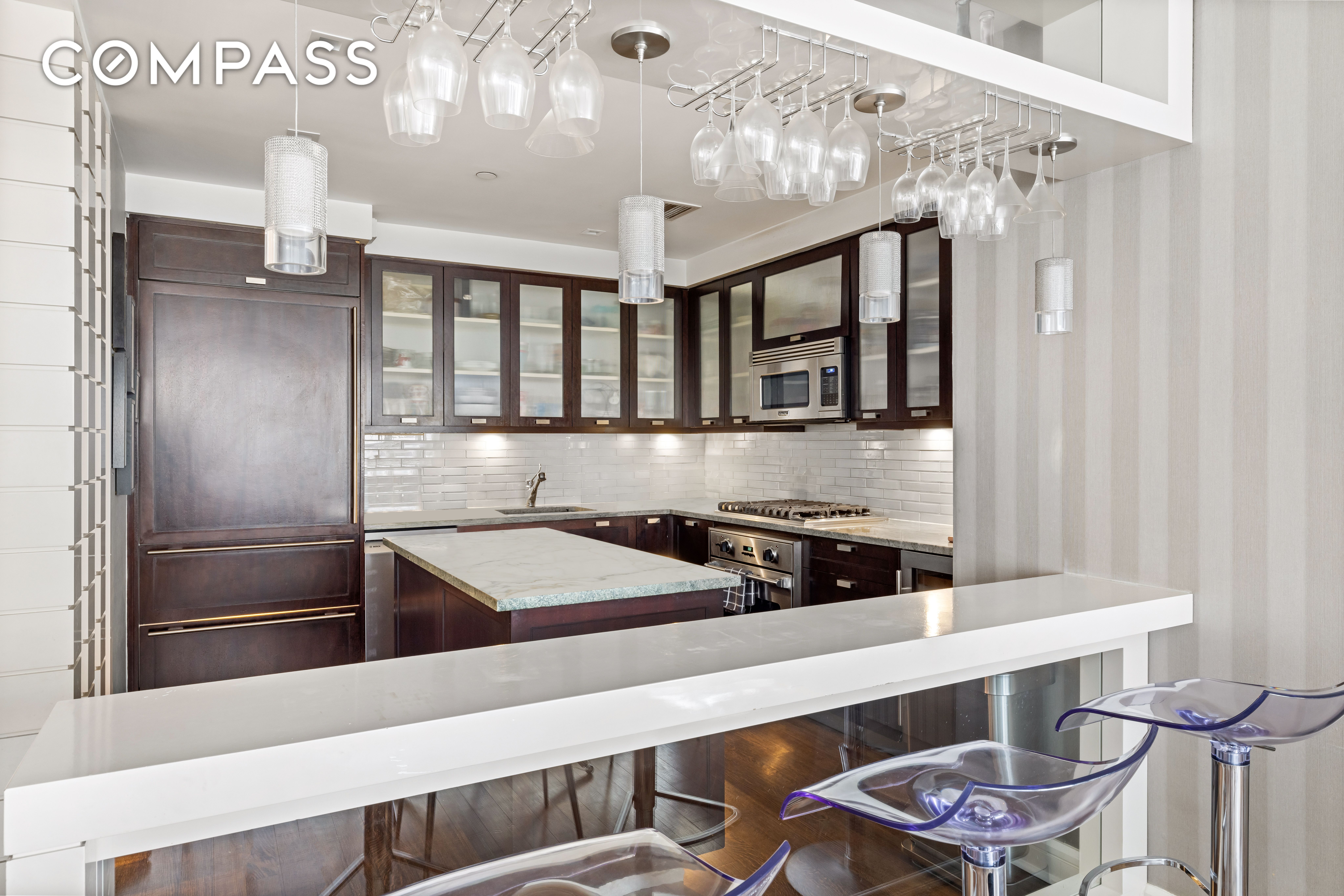 In one of the Upper West Side’s most distinguished buildings, Residence 7E at The Rushmore stands out as a luxurious 3-bedroom, 3.5-bath corner home showcasing refined finishes and iconic Hudson River views. Bathed in natural light from its west and northeast exposures, the residence features wide-plank oak flooring, custom built-ins, and a thoughtfully executed layout. The chef’s kitchen boasts a Sub-Zero refrigerator, wine fridge, Miele dishwasher, Viking 4-burner range and oven, and a generous center island, complemented by a custom dining bar that seamlessly enhances the flow between the kitchen and living space.
