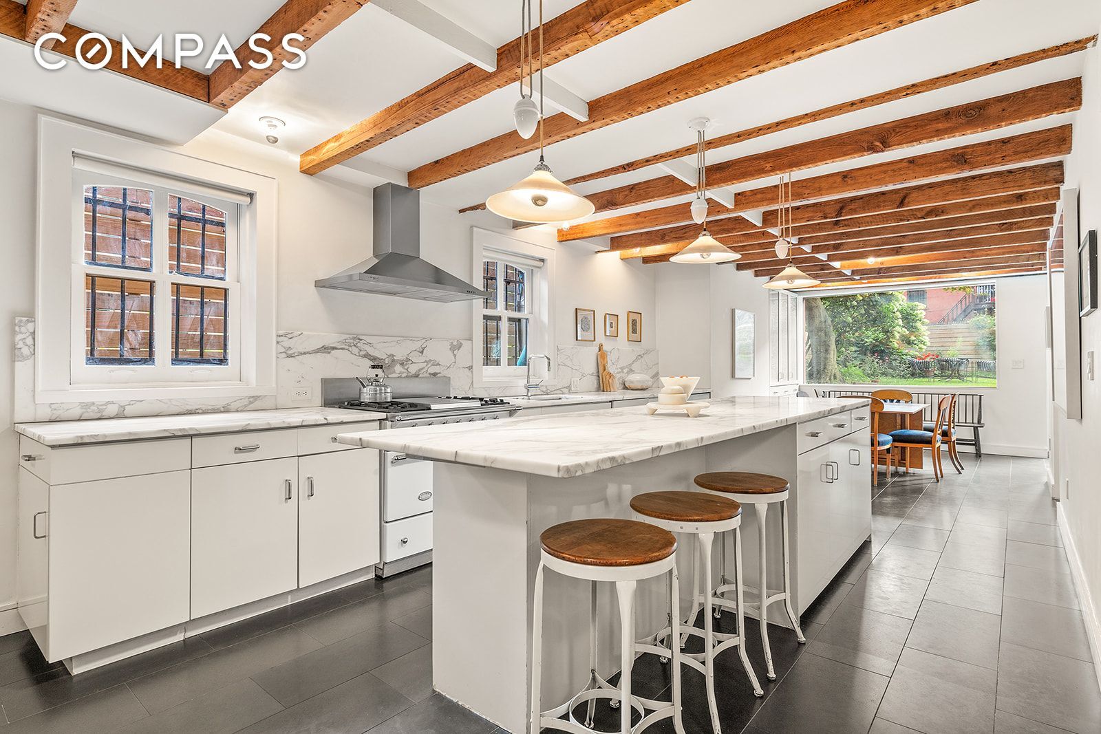 Come inside to find exquisite original details that have been lovingly preserved, including two working fireplaces, crown moldings, and built-ins throughout. Iron tubs in the renovated bathrooms offer the perfect space to unwind and relax. The entire garden level, designed by the renowned architect Annabelle Selldorf, features a massive picture window, a chef’s kitchen with marble countertops, top-of-the-line appliances, extra refrigeration and ample storage in a large pantry. Since the house is semi-detached, there are additional windows on the southern side, making it an unusually bright home. (Not to mention an outdoor side entrance with ample storage for bicycles and firewood). This home also has central air-conditioning.