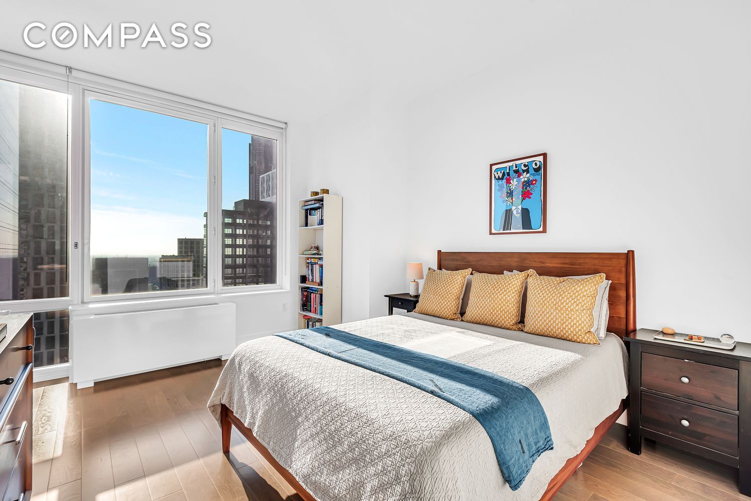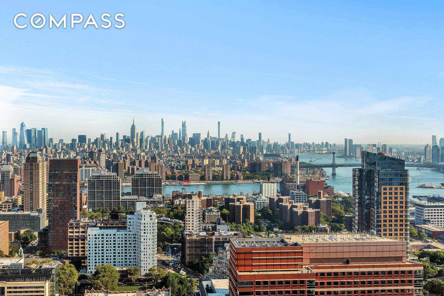 Welcome to this stunning two-bedroom, two-bathroom condo perched on the northeast corner of the building, offering breathtaking unobstructed views of the Manhattan Skyline, the East River, and Brooklyn. The condo features an abundance of natural light with walls of fifteen windows throughout and soaring ceilings over ten feet high, allowing you to enjoy the majestic views both day and night. With five closets, including a custom walk-in closet, there is ample storage space. The efficient layout ensures maximum privacy as the bedrooms are situated in a separate wing from the entertainment space.