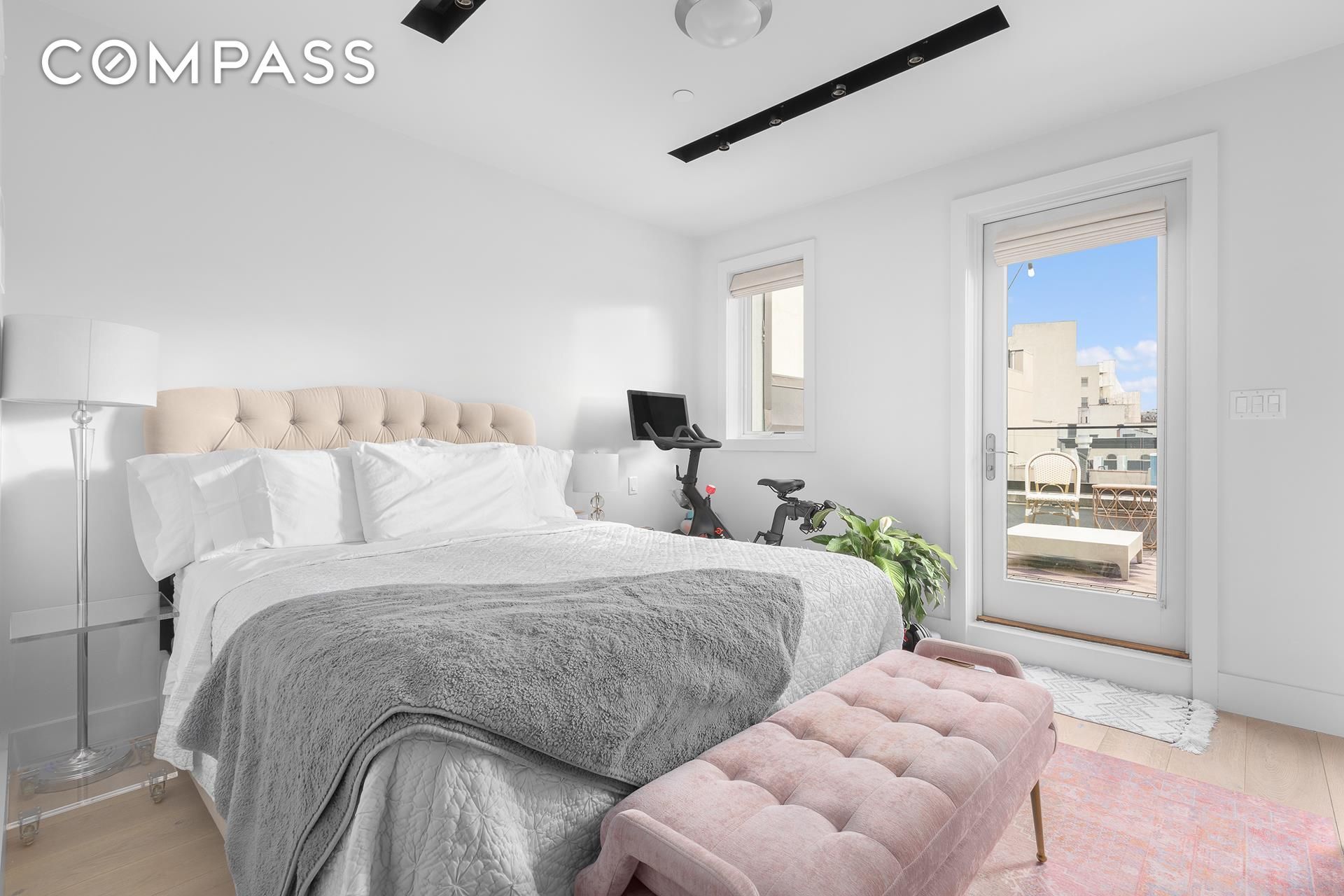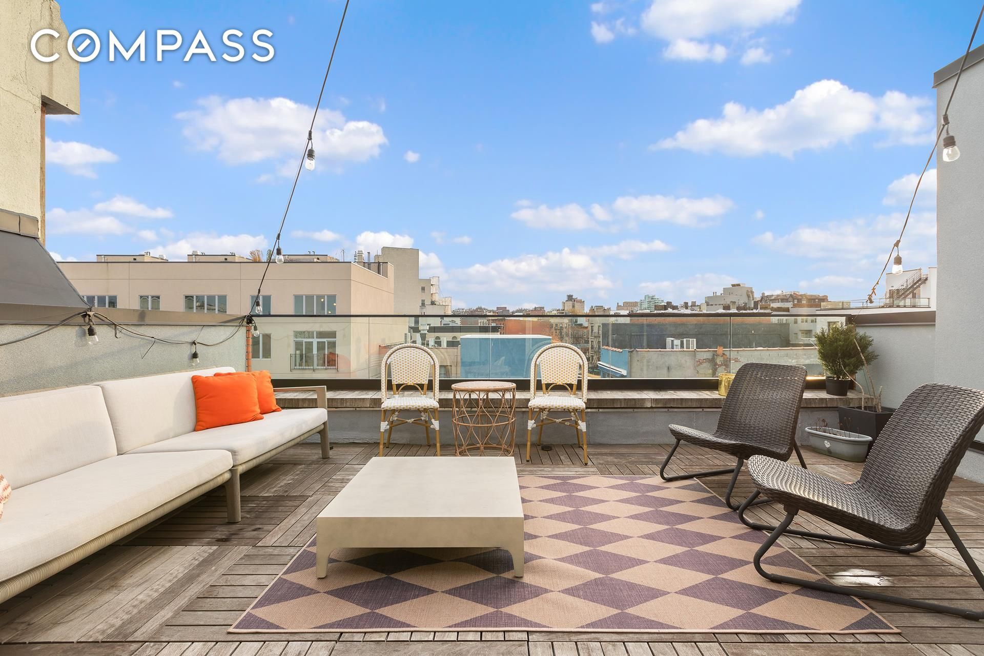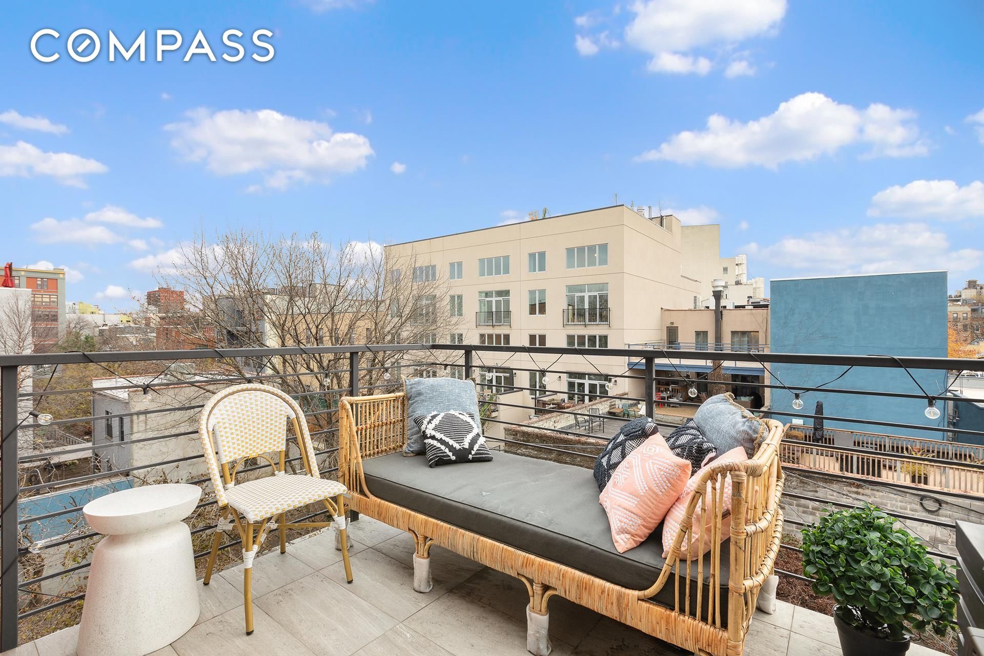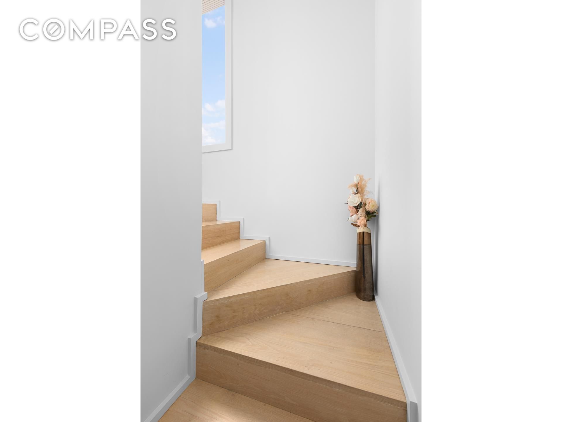 Immediately upon entering this penthouse duplex you notice the quality. To the right, you'll find your 22' long living room and over-sized balcony, a bedroom with deep step-in closet, and a powder room. To the left, your exquisite kitchen with Miele 5-burner gas cooktop, oven, and dishwasher, and lots of counter- and storage- space, including two pantries. Your high-capacity, in-unit washer/dryer even vents out! On the top level is another bedroom and a tremendous contiguous roof terrace, a walk-in closet, and a bathroom with double sink and skylight! Both levels of this home face south and get spectacular sunlight through over-sized windows.