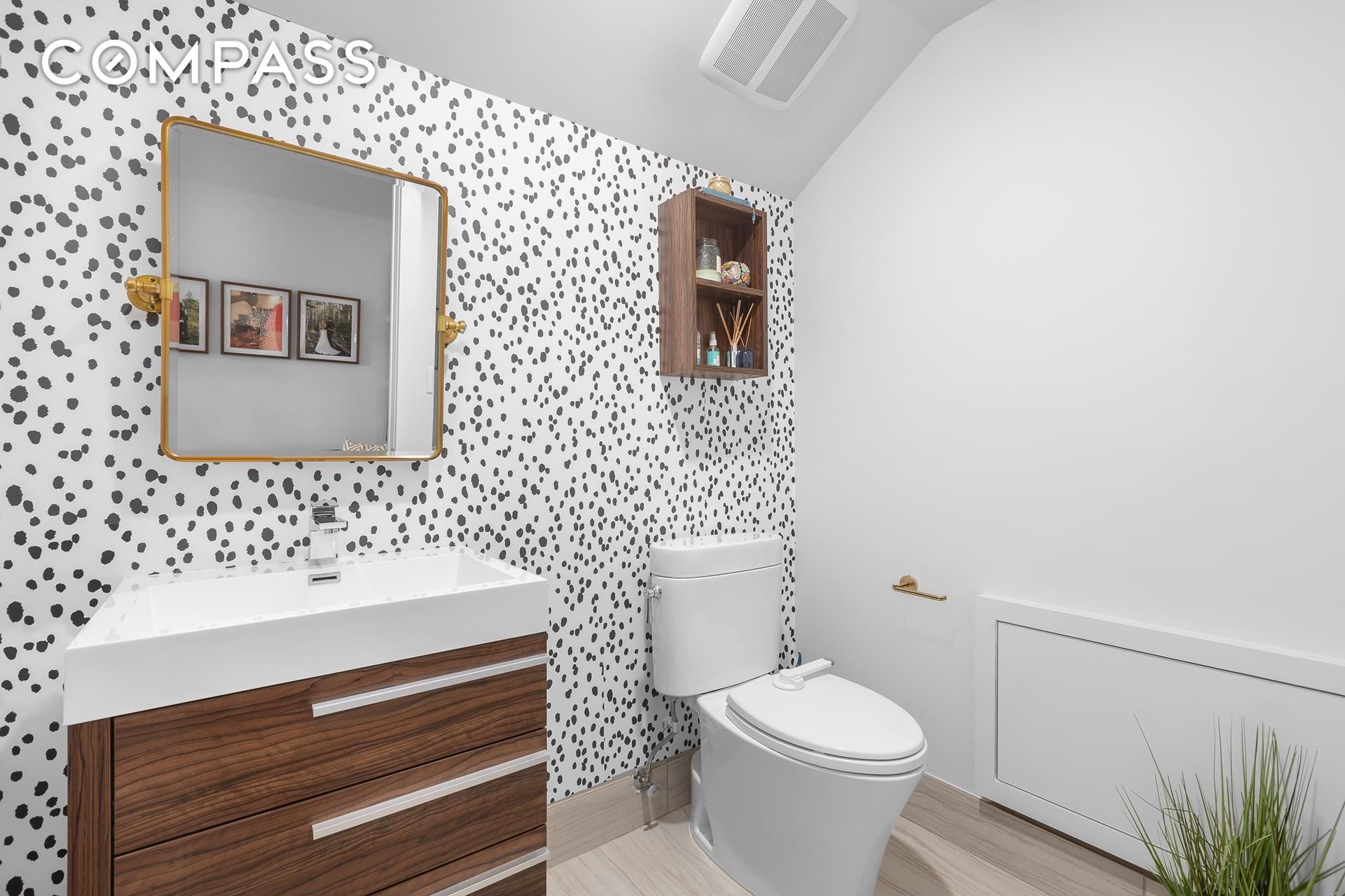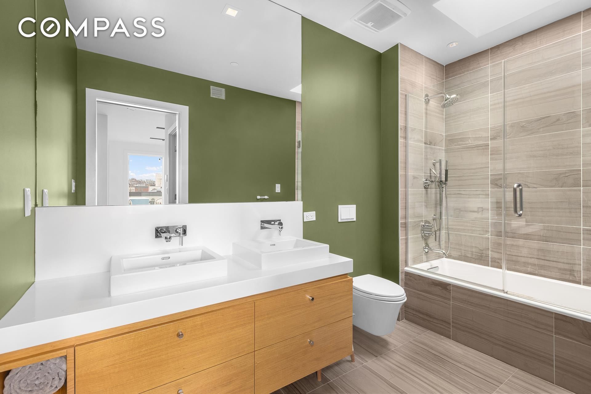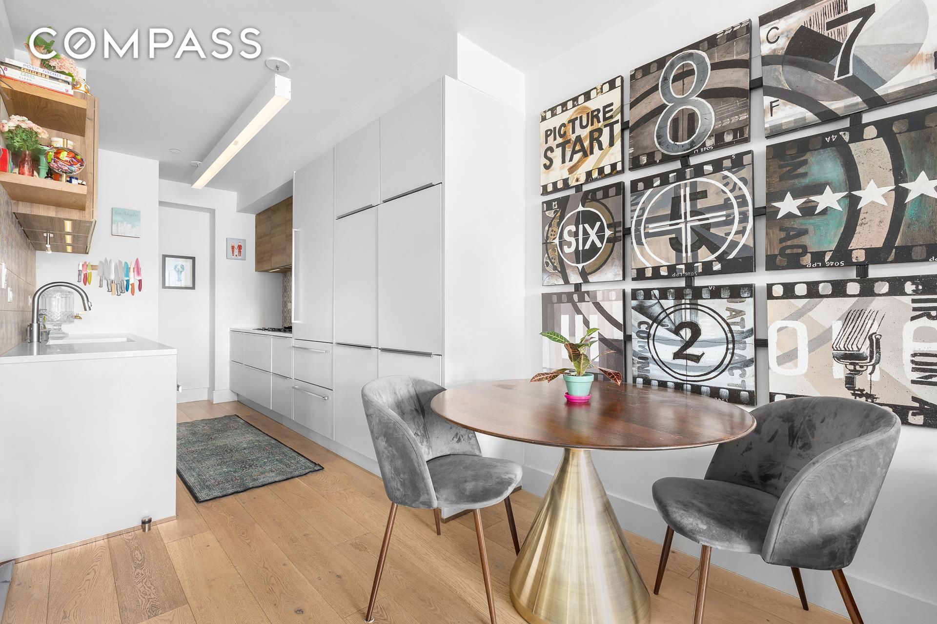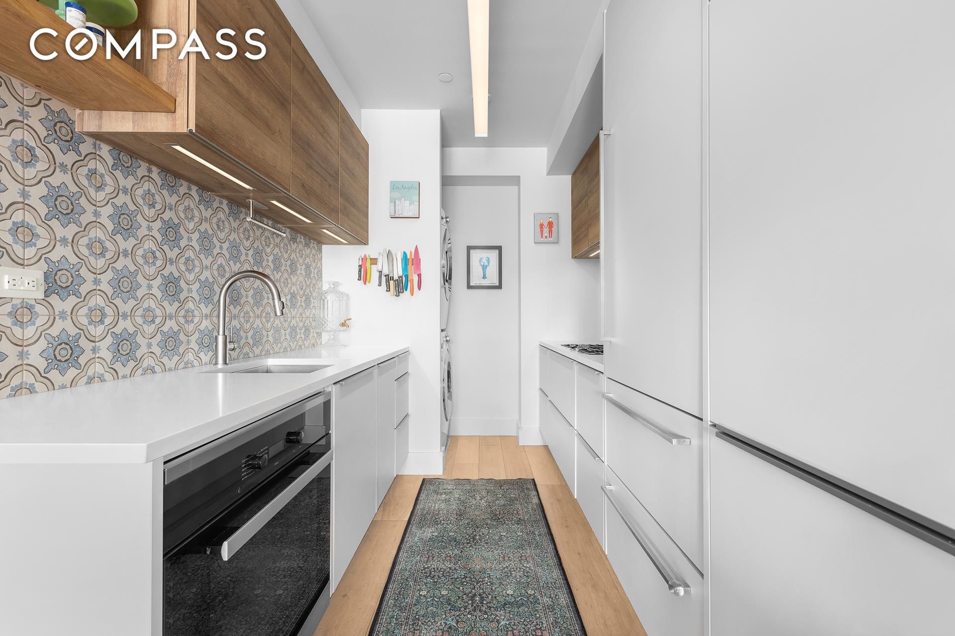 Immediately upon entering this penthouse duplex you notice the quality. To the right, you'll find your 22' long living room and over-sized balcony, a bedroom with deep step-in closet, and a powder room. To the left, your exquisite kitchen with Miele 5-burner gas cooktop, oven, and dishwasher, and lots of counter- and storage- space, including two pantries. Your high-capacity, in-unit washer/dryer even vents out! On the top level is another bedroom and a tremendous contiguous roof terrace, a walk-in closet, and a bathroom with double sink and skylight! Both levels of this home face south and get spectacular sunlight through over-sized windows.