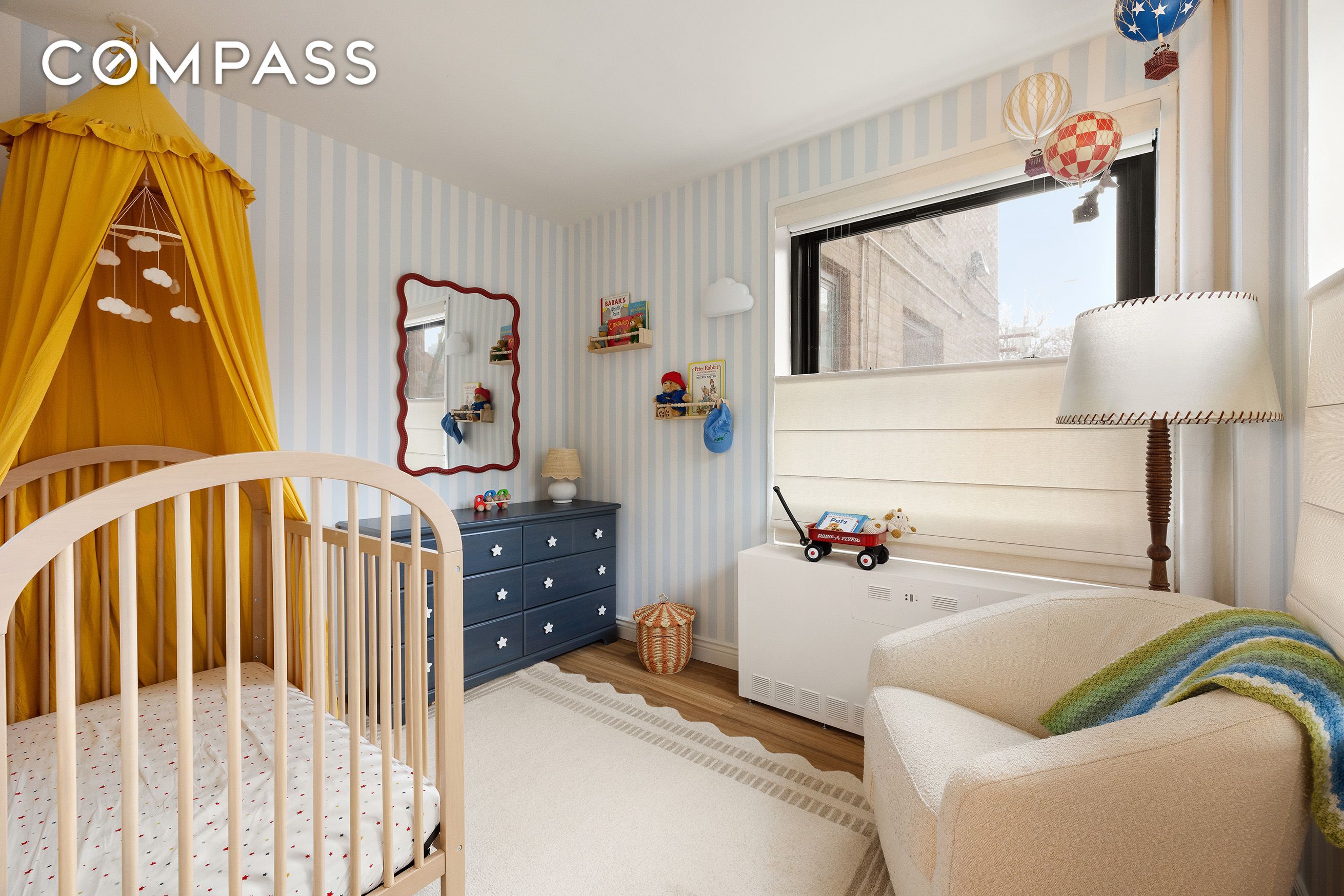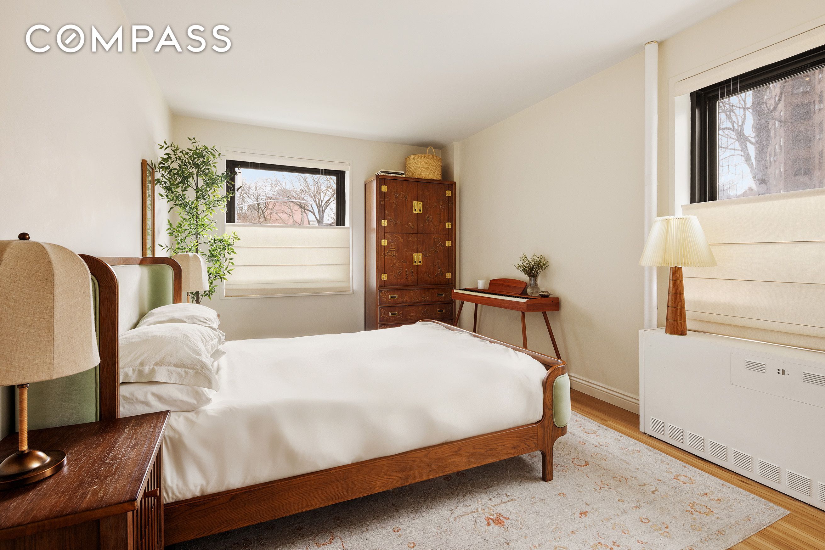 The primary bedroom offers double exposure, generous closets, and comfortably fits a king bed with room to spare. The second bedroom works equally well as a nursery, home office, or guest room.