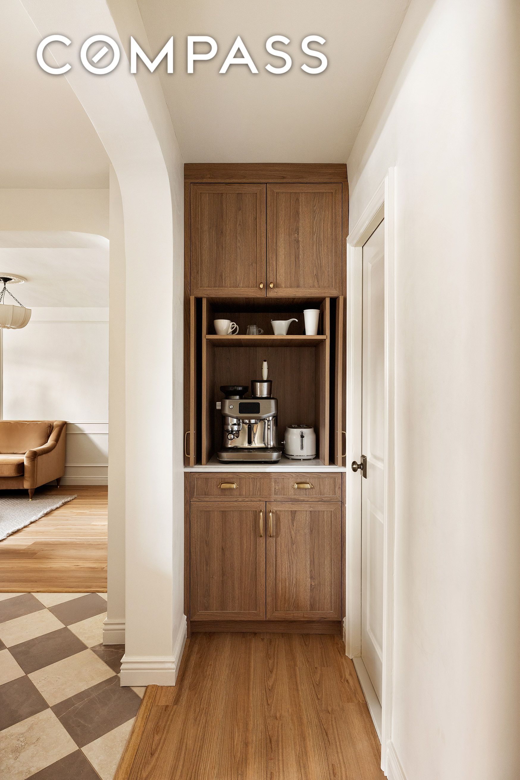 Upon entering, you will appreciate the oversized windows pouring light into the gracious living room, which features a decorative fireplace, and elegant wainscoting throughout. Off the dining area, is a stunning archway that leads into the windowed kitchen, boasting integrated wooden cabinetry, brass fixtures, and a timeless checkered tile floor. A stone island with seating for two and a dedicated built-in pantry and coffee bar complete the space.