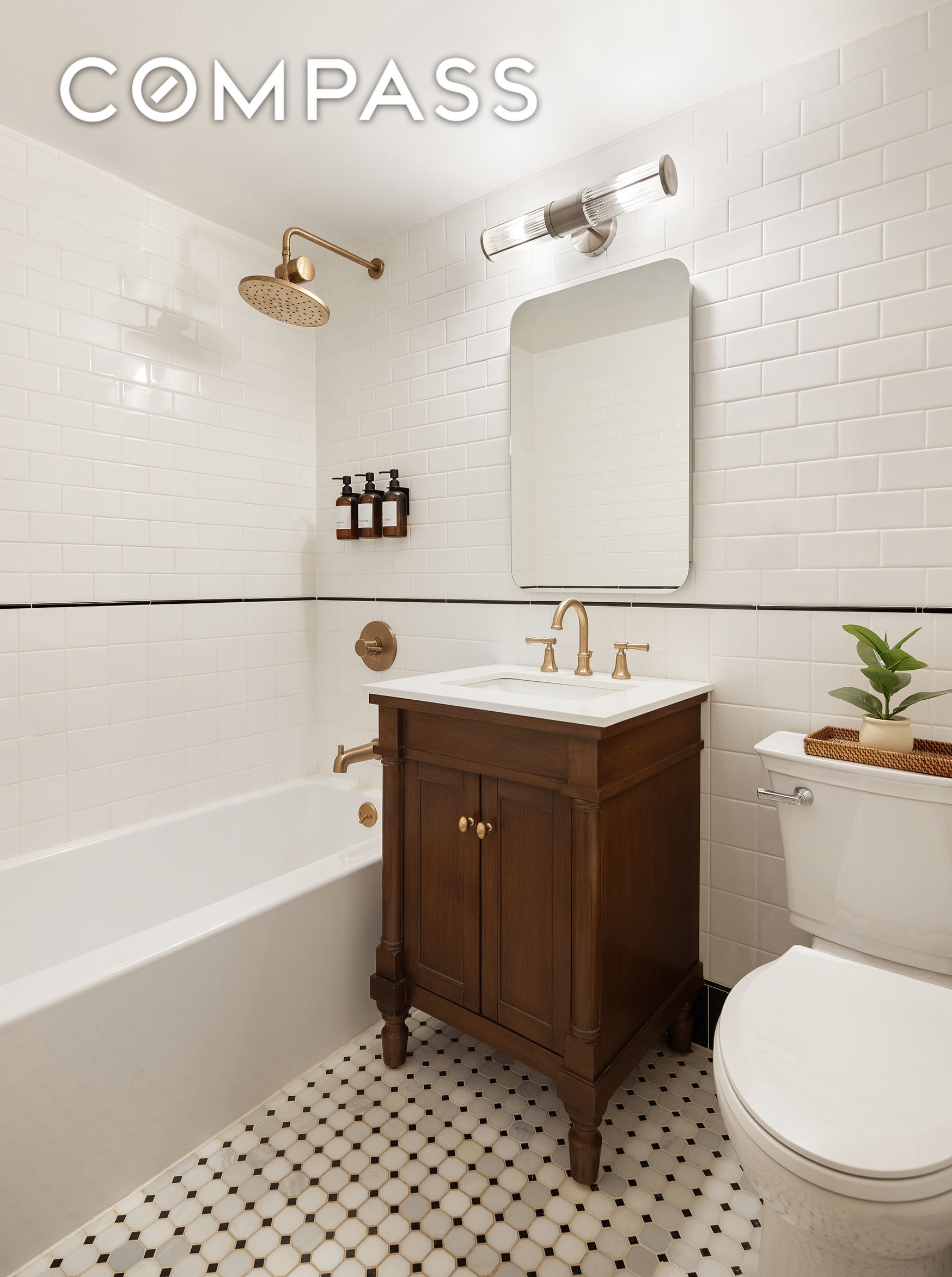 The remodeled bathroom has a warm palette with classic tile and modern finishes.
