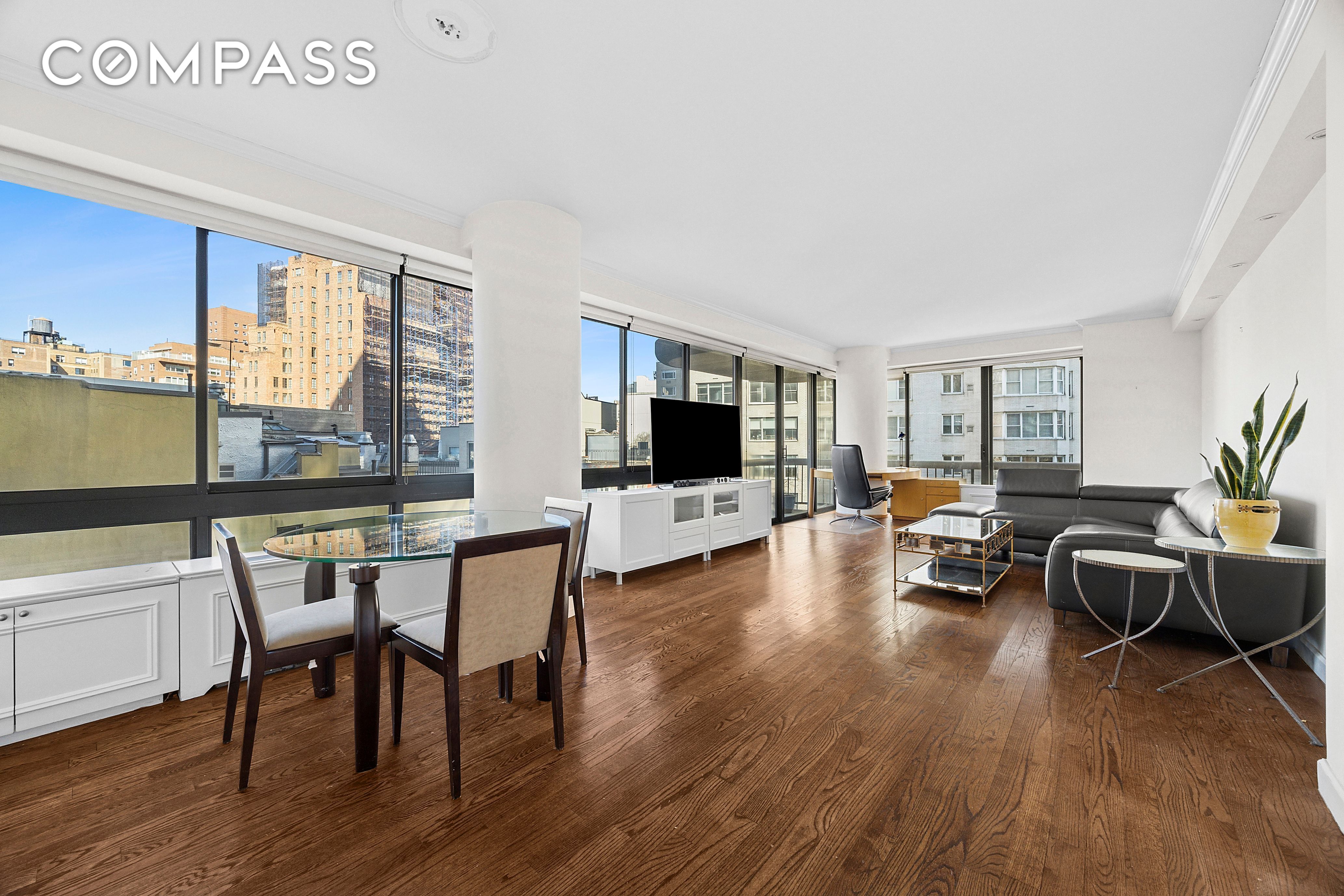 The spacious living and dining areas feature floor-to-ceiling windows.