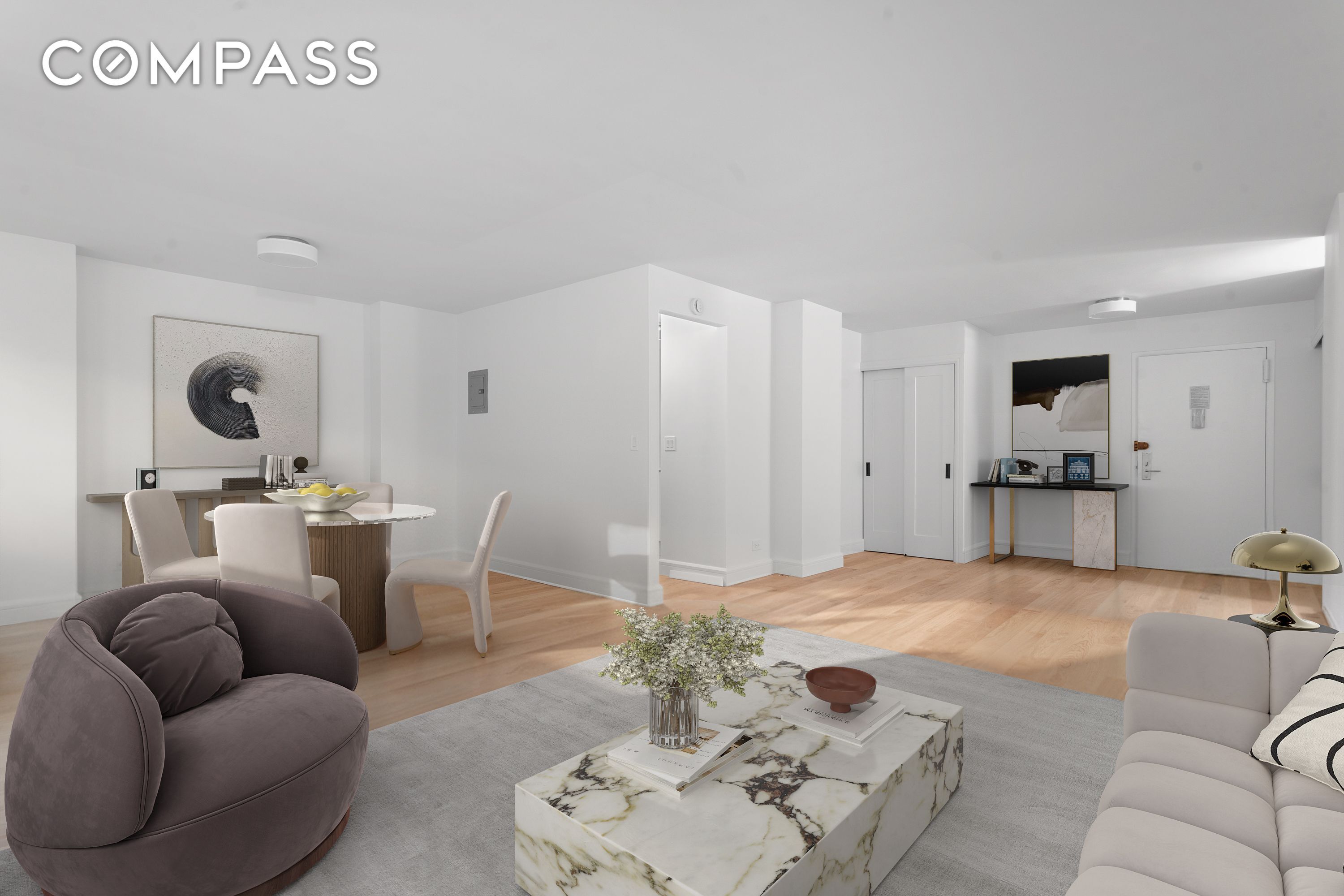 SPONSOR UNIT - NO BOARD APPROVAL REQUIRED Renovation in Progress. Last 4 photos show same finishes on similar unit in building. This jumbo 1-bed/1-bath apartment with a dining alcove is in the process of being gut-renovated -- all that's missing is you! Western sunshine from a wall of windows spills natural light into the sprawling living room/dining alcove and the spacious bedroom, highlighting the newly-installed engineered hardwood floors throughout the apartment. The kitchen will have new white ceiling-height cabinets and high-end appliances, caesarstone countertops and marble backsplash. The bathroom will have marble floors and subway-tiled walls for a clean modern look. There are multiple generously-sized closets for ample storage space. The Mayfair is classic luxury co-op located in the heart of the Upper East Side. Amenities include a full time doorman, live-in superintendent, and a roof deck, as well as laundry rooms on every other floor, a garage, and optional bike and storage rooms. Pets welcome. Ongoing assessment of $220.39/month.