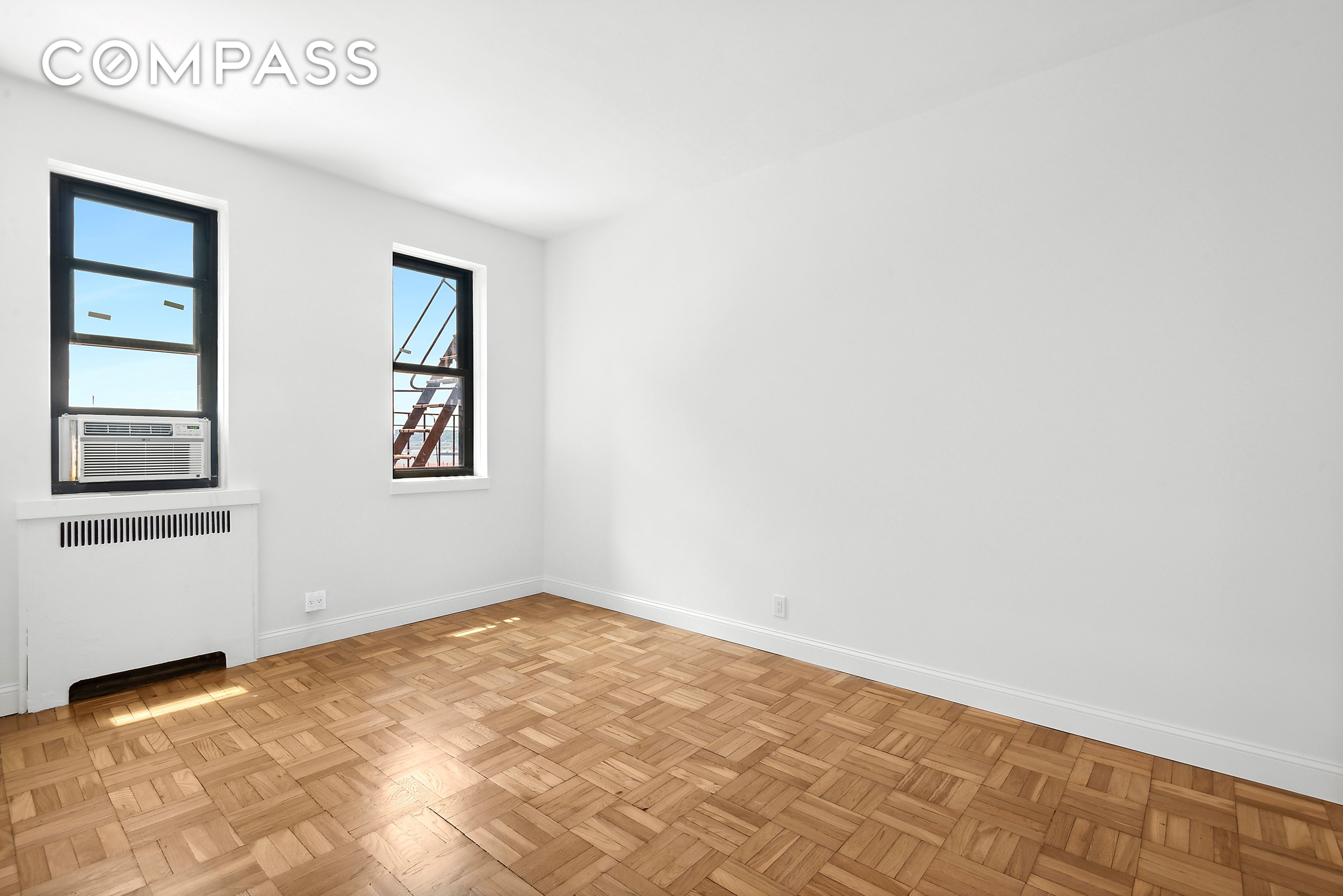 Down the hall, the spacious king-sized bedroom enjoys bright southern exposure and peaceful morning light. Excellent closet space throughout the apartment provides abundant storage.