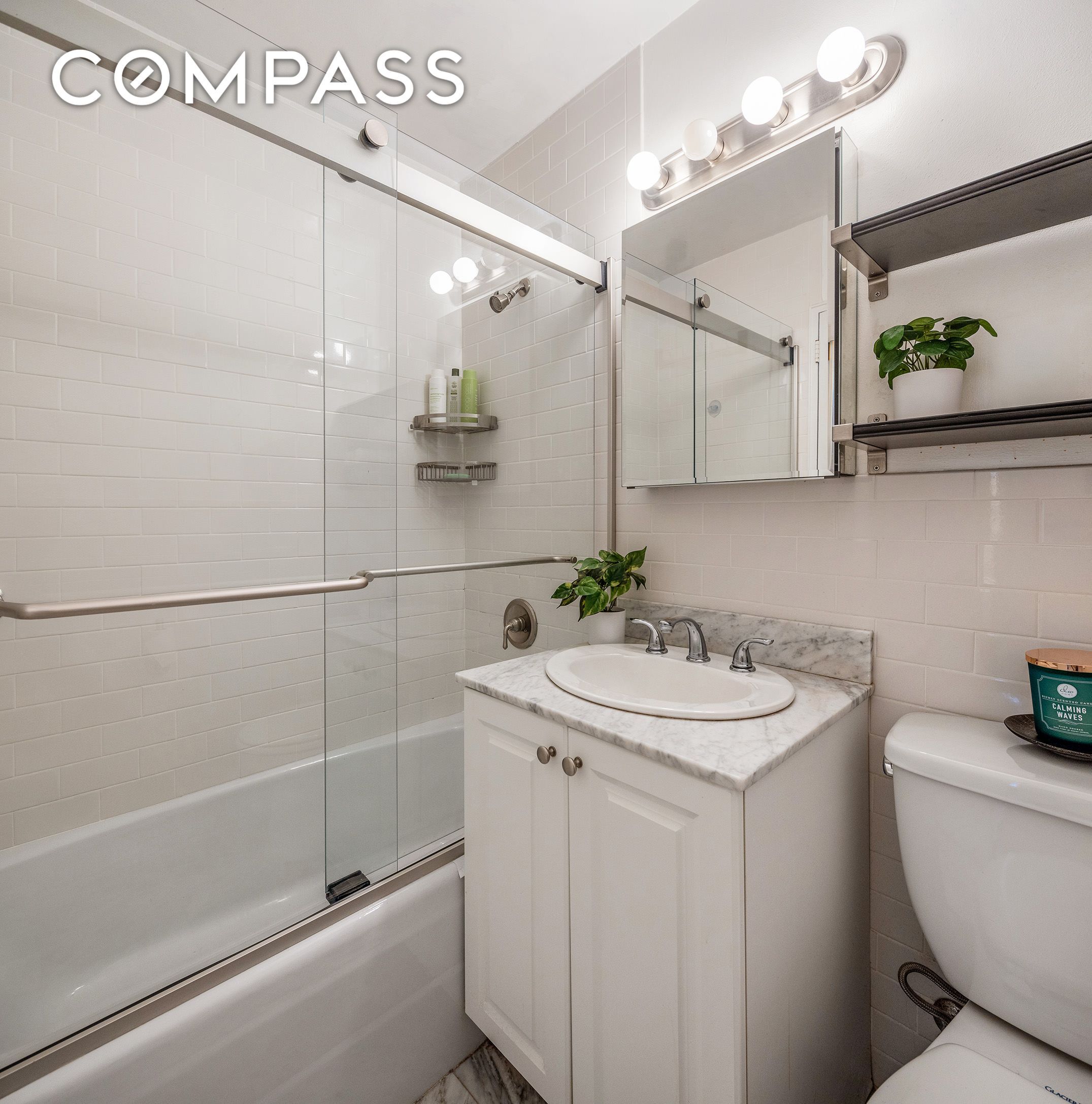 The kitchen is outfitted with granite countertops, generous cabinet storage, and stainless-steel appliances, including a dishwasher. The bathroom features added shelving, a marble vanity, and a glass-enclosed bathtub and shower finished with classic subway tile.