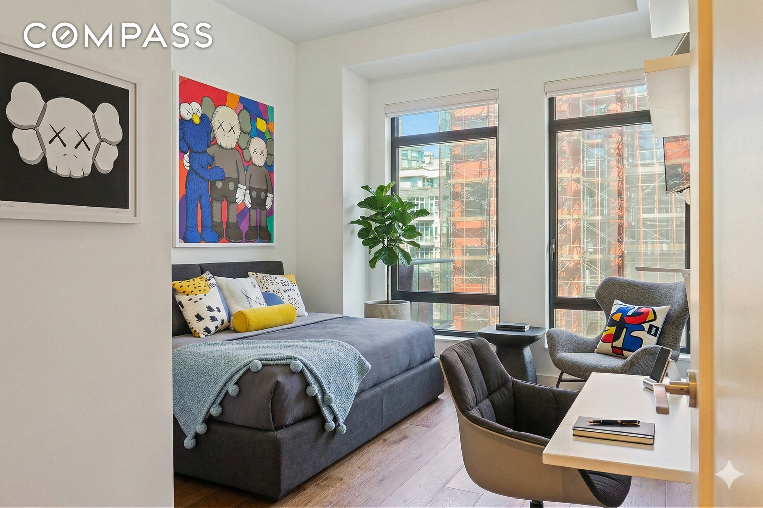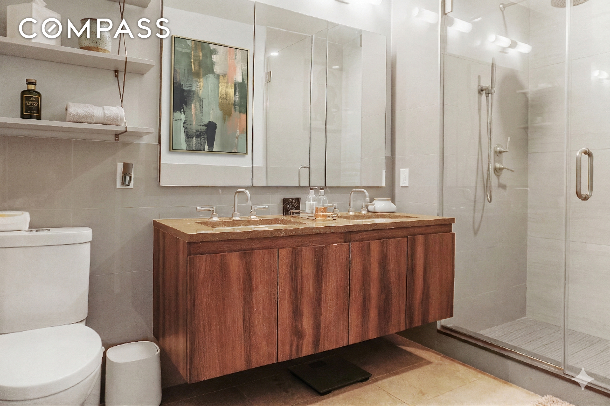 The king sized primary bedroom offers double closets and an en suite bathroom with a double vanity, marble tile, heated floors, rain shower, and Rohl fixtures. The second bedroom provides flexible use for guests, a home office, or nursery.