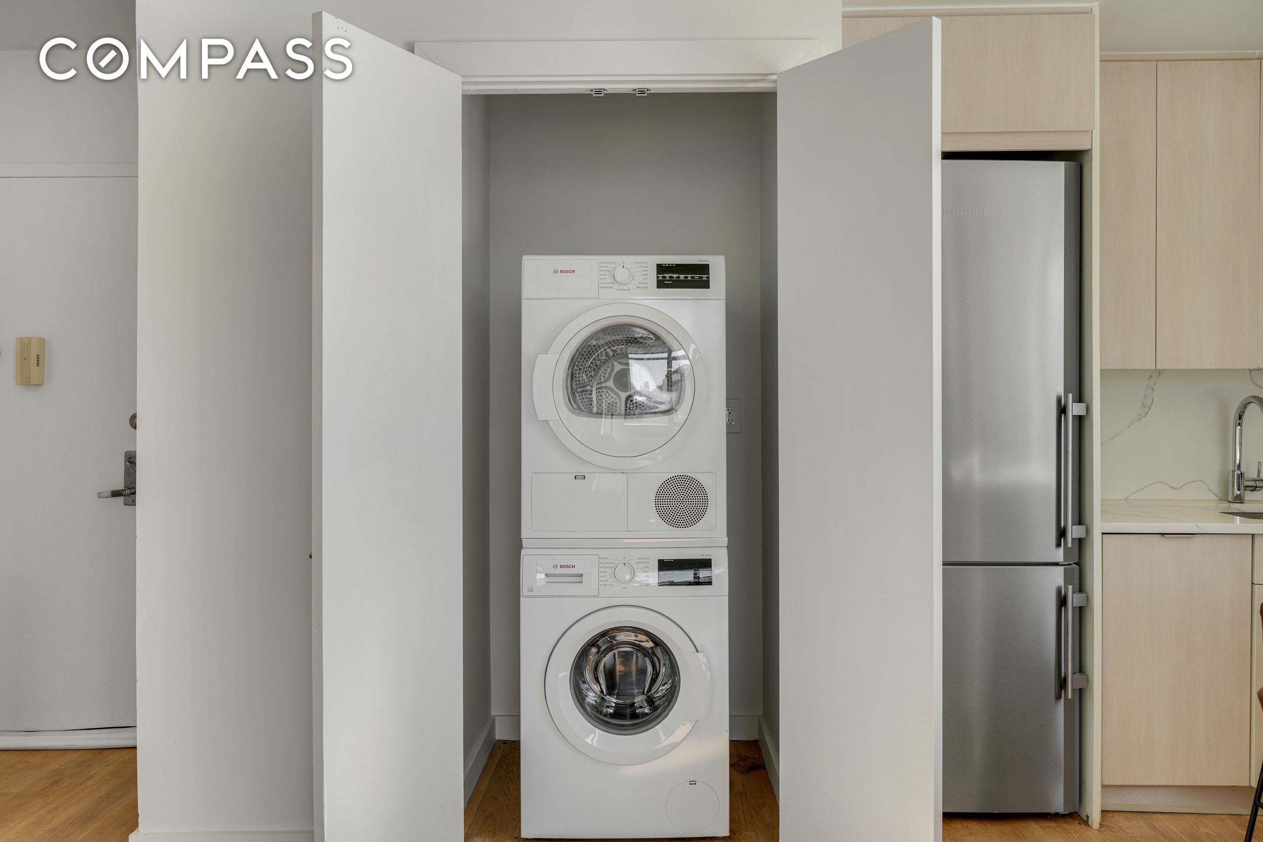 Welcome to Residence 6B—one of only two top-floor, corner one-bedroom residences at 175 Spencer Street, featuring an extraordinary private outdoor space. Thoughtfully designed and filled with natural light, this home strikes the perfect balance of modern comfort, indoor-outdoor living, and effortless Brooklyn style. Inside, the open layout features wide-plank hardwood floors and southeast oversized windows that provide an abundance of natural light, with views of the downtown Brooklyn skyline. Exposed concrete ceilings provide enhanced sound insulation—ideal for working from home or those who value a quieter home. The living area flows seamlessly into a sleek kitchen featuring Calacatta stone countertops, custom cabinetry, and premium Bosch and Liebherr appliances. The generously sized bedroom fits a king bed. Additional highlights include a Nest thermostat, and an in-unit Bosch washer and dryer. Enjoy a full suite of building amenities including secure virtual entry, bike and package rooms, on-site laundry, and a shared roof deck with skyline views. The building also benefits from a 421a tax abatement through 2036 with taxes currently at $14.88 / month. Monthly parking is available for rent from other owners who have purchased spaces. Storage is currently waitlisted. Fees for both vary depending on the owner. Perfectly positioned at the intersection of Bed-Stuy, Clinton Hill, and Williamsburg, this home offers effortless access to some of Brooklyn’s most vibrant and sought-after neighborhoods. Enjoy afternoons at Fort Greene Park, stroll picturesque tree-lined streets, explore local galleries, or take advantage of the ever-expanding Brooklyn Navy Yard with its growing mix of retail, dining, and lifestyle destinations. Just a few short blocks from the Bedford-Nostrand G train, commuting throughout Brooklyn, Manhattan, and Queens is both easy and convenient.