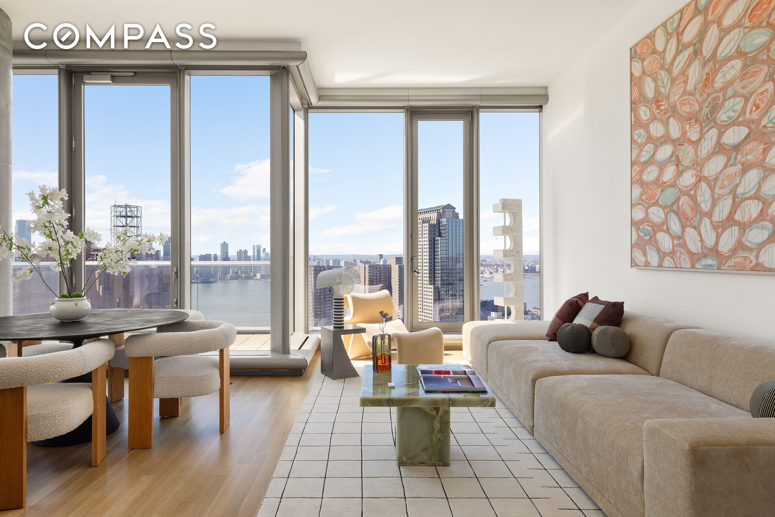 This exceptional 2-bedroom, 2.5-bathroom residence offers soaring 11-foot ceilings and floor-to-ceiling windows that flood the space with natural light, showcasing coveted South and West exposures with breathtaking views of the Lower Manhattan skyline and Hudson River. The great room opens to a private terrace, creating seamless indoor/outdoor living perfect for entertaining or relaxing.