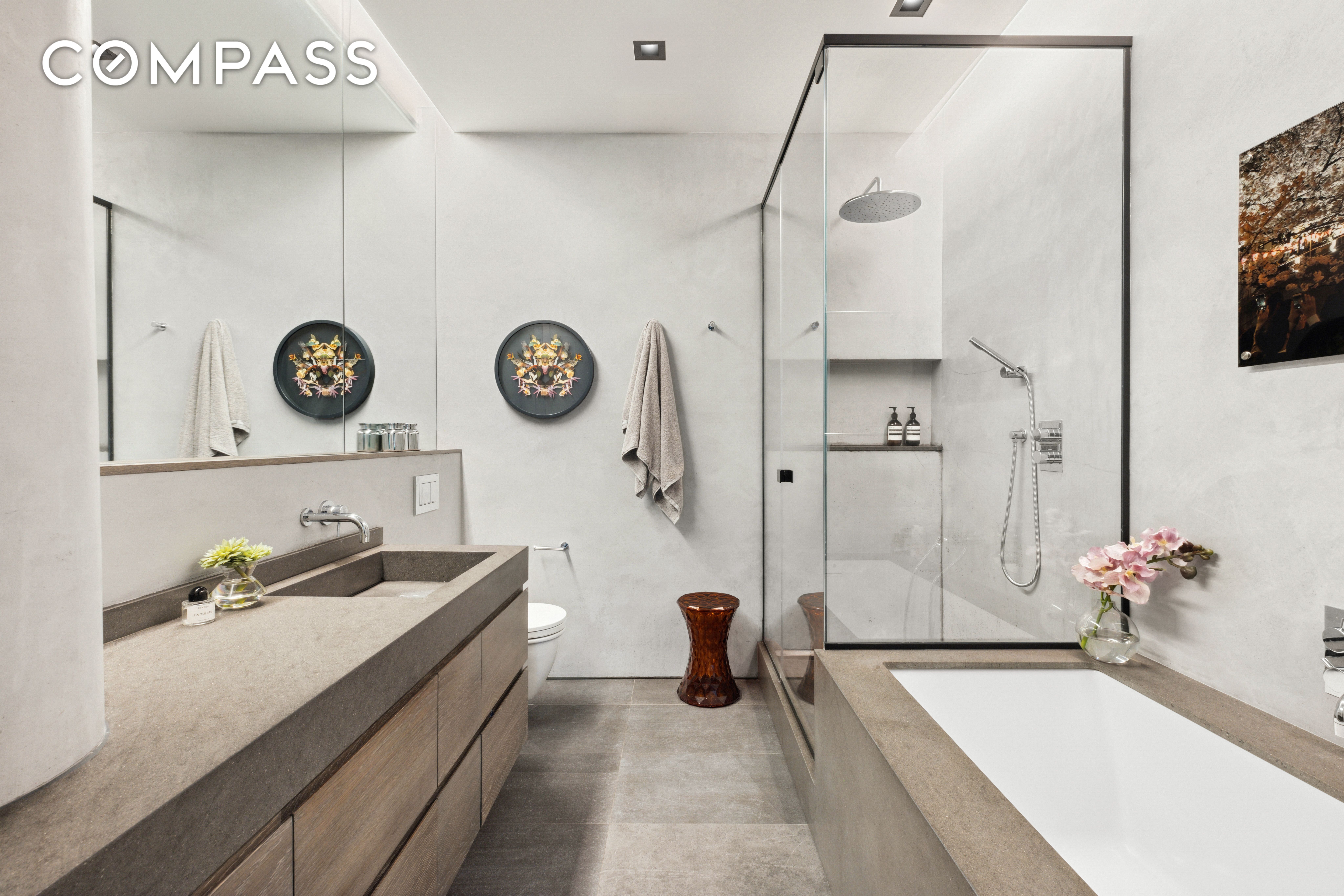 The primary suite is serene and well proportioned, featuring a custom dressing area and a spa like en-suite bathroom with a soaking tub, walk-in rain shower, custom vanity, and microcement finishes throughout. The second bedroom is equally well scaled and is served by its own full bathroom.