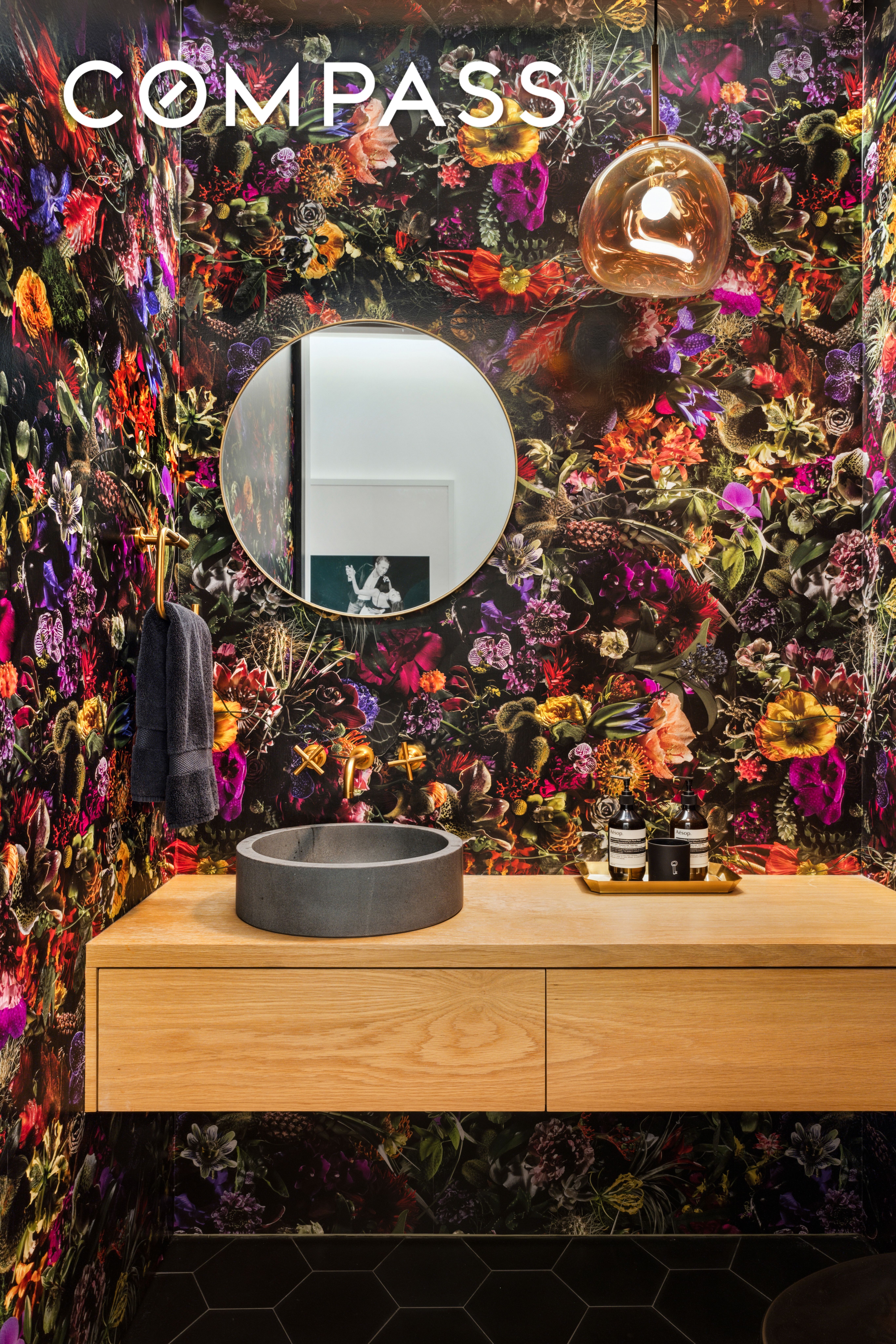 A striking powder room offers a moment of contrast through richly patterned botanical wall coverings and sculptural lighting.