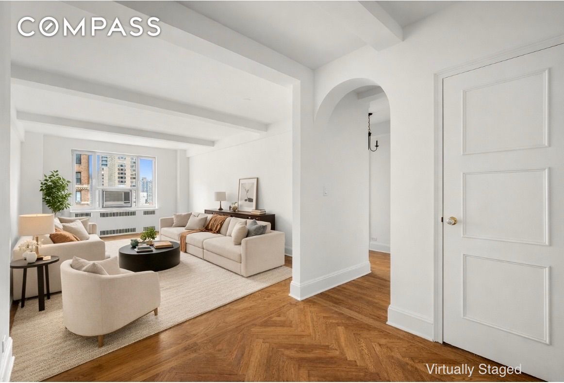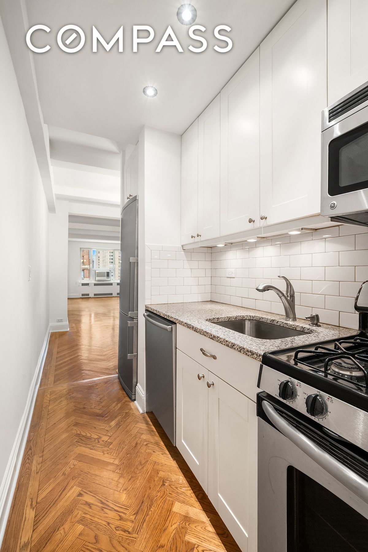 Perched high above Park Avenue, unit 15H is an expansive 1-bedroom apartment in mint condition with all the elegance and character you would expect in a prewar home. From its many large windows, all with sunny eastern views over Park Avenue and the surrounding Murray Hill area, to its impeccable herringbone floors throughout, its high 9-foot ceilings, its fully renovated kitchen and bath and many closets, this is a home built for comfortable and convenient city living. The home’s gracious layout is evident as soon as you enter its inviting foyer, suitable for dining area, greeting guests or even home office. Beyond the foyer a bright and spacious living room with large picture window beckons, and the very private primary bedroom with two large closets is located discretely away on its own, reached through a large dressing or sitting area which provides not only privacy but an additional closet and also access to the renovated bath, easily reached by guests and owner alike without needing to enter the bedroom. The amply proportioned and renovated kitchen, located conveniently near the foyer and living room, features sturdy white cabinetry, stone countertops, quality appliances including dishwasher, and a glass-fronted display cabinet perfect for showing off beautiful dishware. 50 Park Avenue is a 17-story full-service cooperative designed by architect George F. Pelham, Jr. and built in 1940. The building features an incredible, central, location close to Grand Central Station, Union League Club, Morgan Library, midtown Manhattan and many transportation options including MetroNorth and LIRR trains, #4/5/6/7/S subways, up and downtown bus lines. There is landscaped roof terrace with panoramic views, central laundry room, bike room, live-in superintendent, and is pet friendly. Private deeded storage is also available for purchase at an extra cost. Pied-a-terre/Co-Purchasing/Gifting, and financing up to 70% is permitted. Come home to 50 Park Avenue #15H, your beautiful prewar home high above, but nearby to, it all. Some photos are virtually staged.
