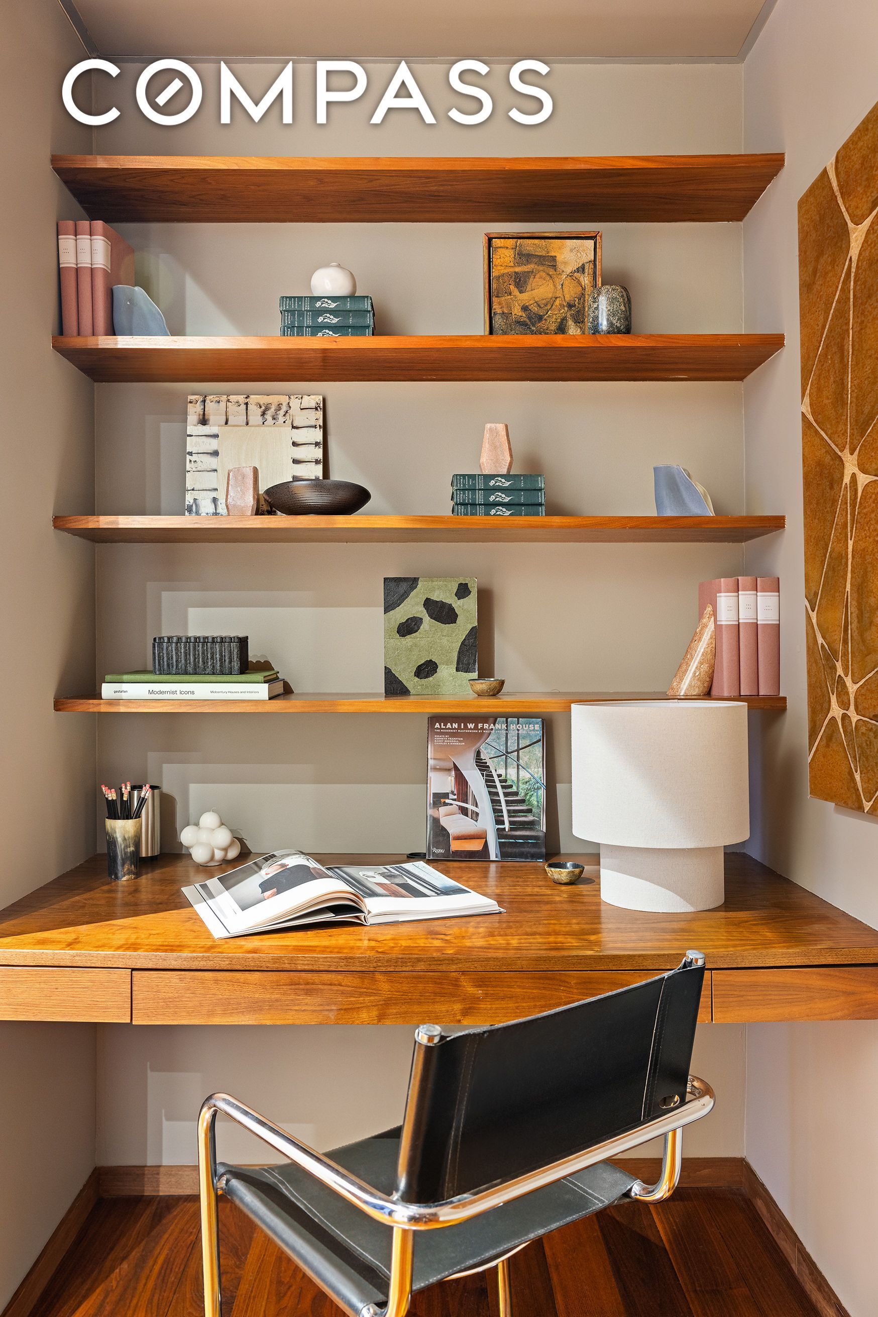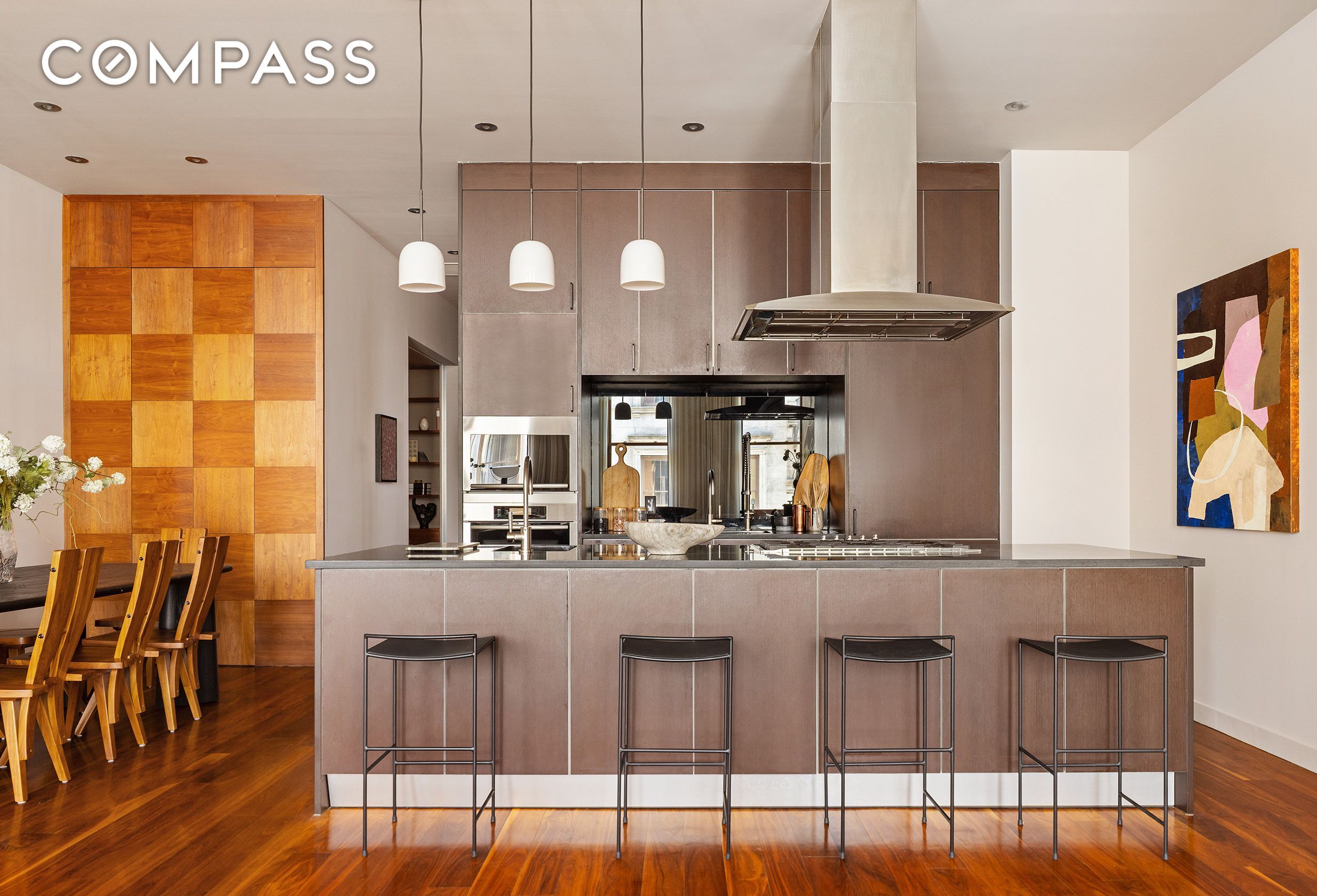 This exquisite residence boasts soaring ceilings and oversized windows, creating an airy, inviting atmosphere. Enter into the foyer that leads to an expansive living and dining area featuring a cozy wood-burning fireplace and views over Mercer Street. The open chef’s kitchen has stainless steel appliances, a vented hood over the large island, and ample cabinetry. The dining area can accommodate dinners of any size and has a huge closet / pantry with built-out shelving behind stunning wood inlay doors.