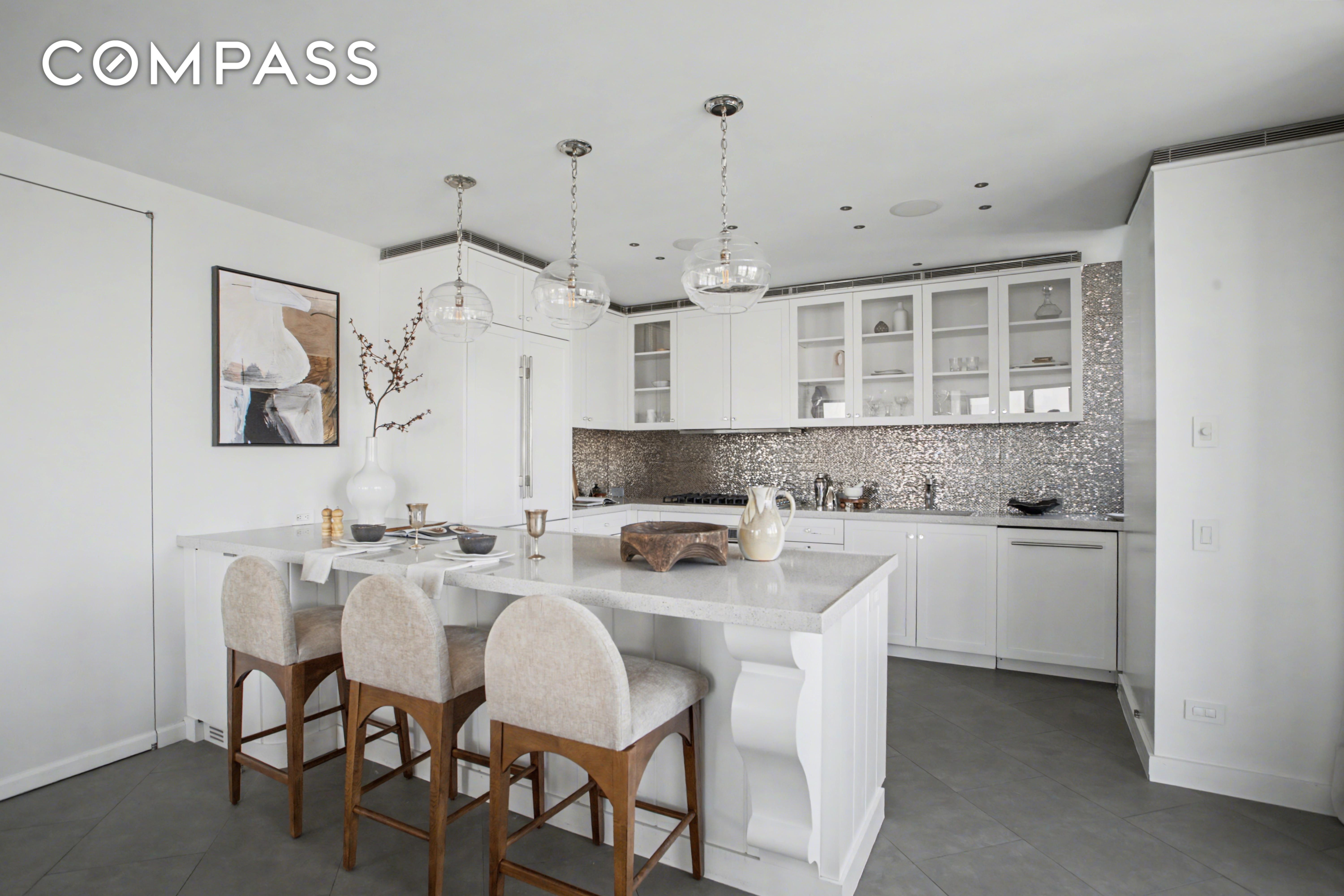 Upon entry to the West is the vast living space with Northwest facing views. Along with two coat closets is a full bathroom, as well as eat-in kitchen. The chef’s designer open kitchen with Porcelanosa stone countertops and backsplash includes a breakfast bar and top of line appliances: Liebherr, Wolf, Viking 6 burner stove, and hidden Miele Washer & Dryer.