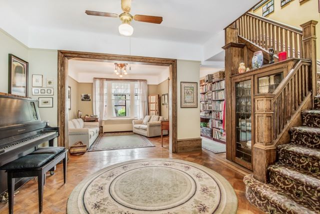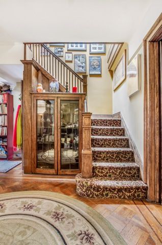 This gorgeous three-level brick townhouse, located just two blocks south of Prospect Park, epitomizes classic neighborhood Brooklyn. With four bedrooms and a flexible floorplan spread over 2,900 square feet, there’s plenty of space for quiet family time or lavish entertaining. The pre-war Craftsman-style home retains many of its original features, including hardwood floors, stairs and banisters; multiple stained glass windows and skylights; doors — one with beveled glass — and doorbell; antique mirror in the entryway and the timeless lamp in the living room. Emblematic of the Arts & Crafts movement, there is rich, exposed wood throughout, most notably in the molding and beams that lead you from the living room to gallery, through the dining room to the oversized eat-in kitchen. Here, you'll find ample prep and storage space thanks to abundant cabinetry and a walk-in pantry. The private terrace, perfect for grilling, and the large garden beyond provide the perfect backdrop for lively morning meals. A grand staircase, illuminated by a gorgeous stained glass skylight overhead, leads to the home's private quarters. The master suite, with its en suite bath and two sizable closets, is the crown jewel of the level with three windows catching warm southern sun. The three other bedrooms each have spacious closets and surround a full bathroom lit by another stained glass skylight. The lovely rear bedroom, an extension totaling more than 237 square feet, is surrounded by windows on three sides. The basement level is filled with conveniences and extra space. There's a large laundry room with full-size washer-dryer and a convenient sink, a powder room, several closets and storage rooms, and two large rooms suitable for use as a home gym, play room, library, wine cellar, craft room, or whatever suits your needs. Set in Windsor Terrace, the home is surrounded by the best of Brooklyn, including neighborhood favorites like Italian hot spot Tuscan Gun, Down Under Bakery offshoot Dub Pies, American classic Krupa Grocery, purveyor of Chinese treats East Wind Snack Shop and acclaimed yoga studio, Yoga Sole. The 585 acres of Prospect Park are practically at your doorstop, including the year-round greenmarket held at Bartel-Pritchard Square, and F and G trains are just one block away, putting the rest of New York City within easy reach.