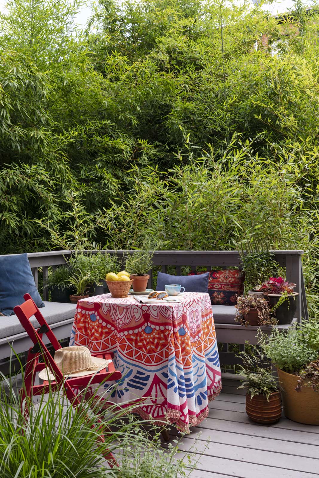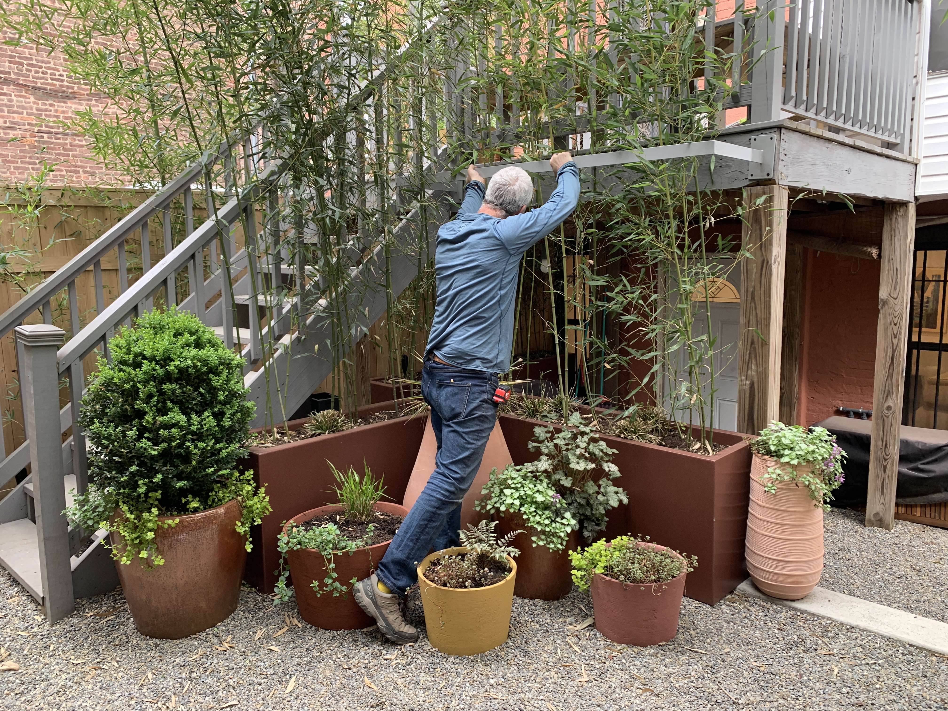 A couple of deep maroon rectangular fiberglass planters contain more bamboo to screen the area underneath the deck.