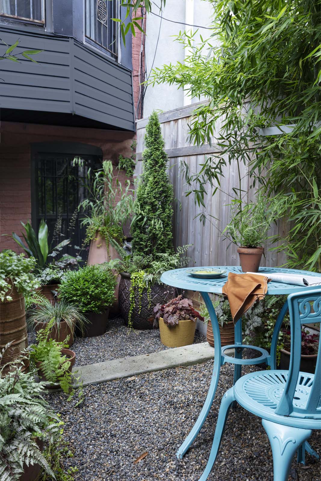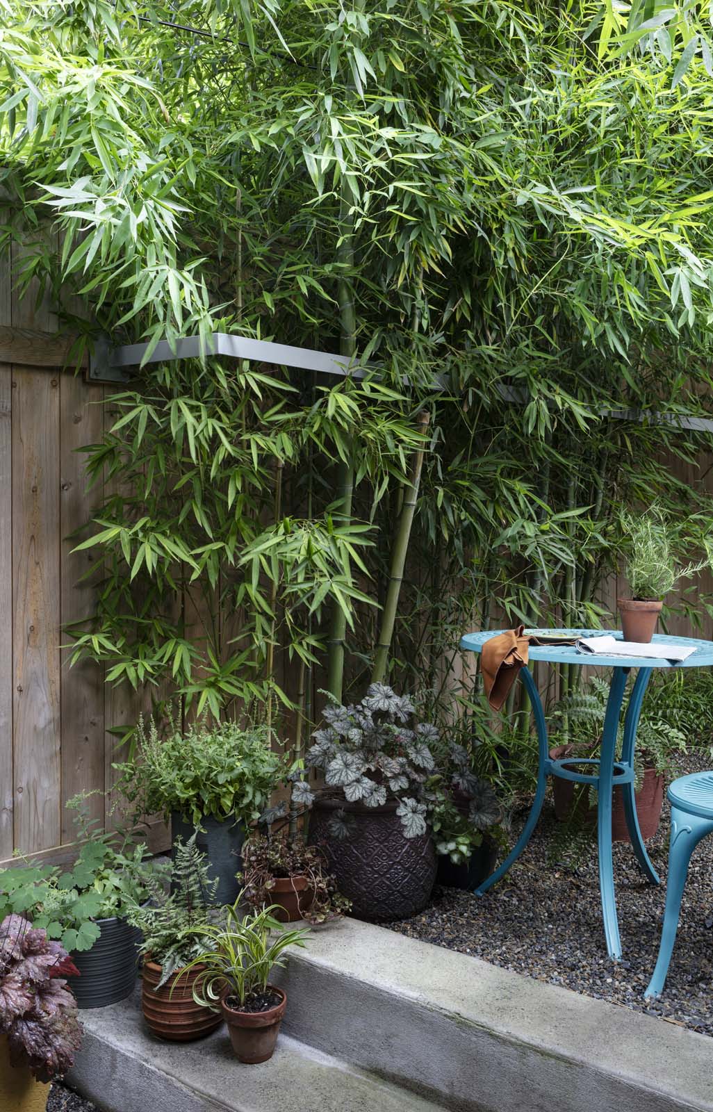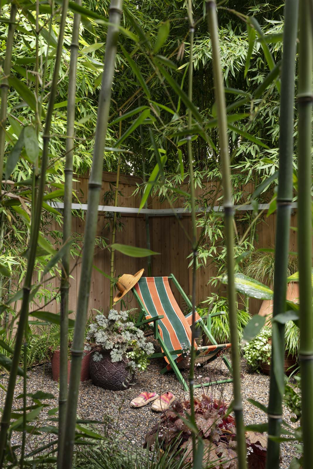 Necessity is the mother of invention, they say. That was certainly true of this exuberant outdoor space, wrapped in towering bamboo and studded with clusters of vibrant pots on a pea gravel surface. It adds up to a secluded spot with a tropical feel, for a client who wanted to use her garden for quiet reading and entertaining guests.