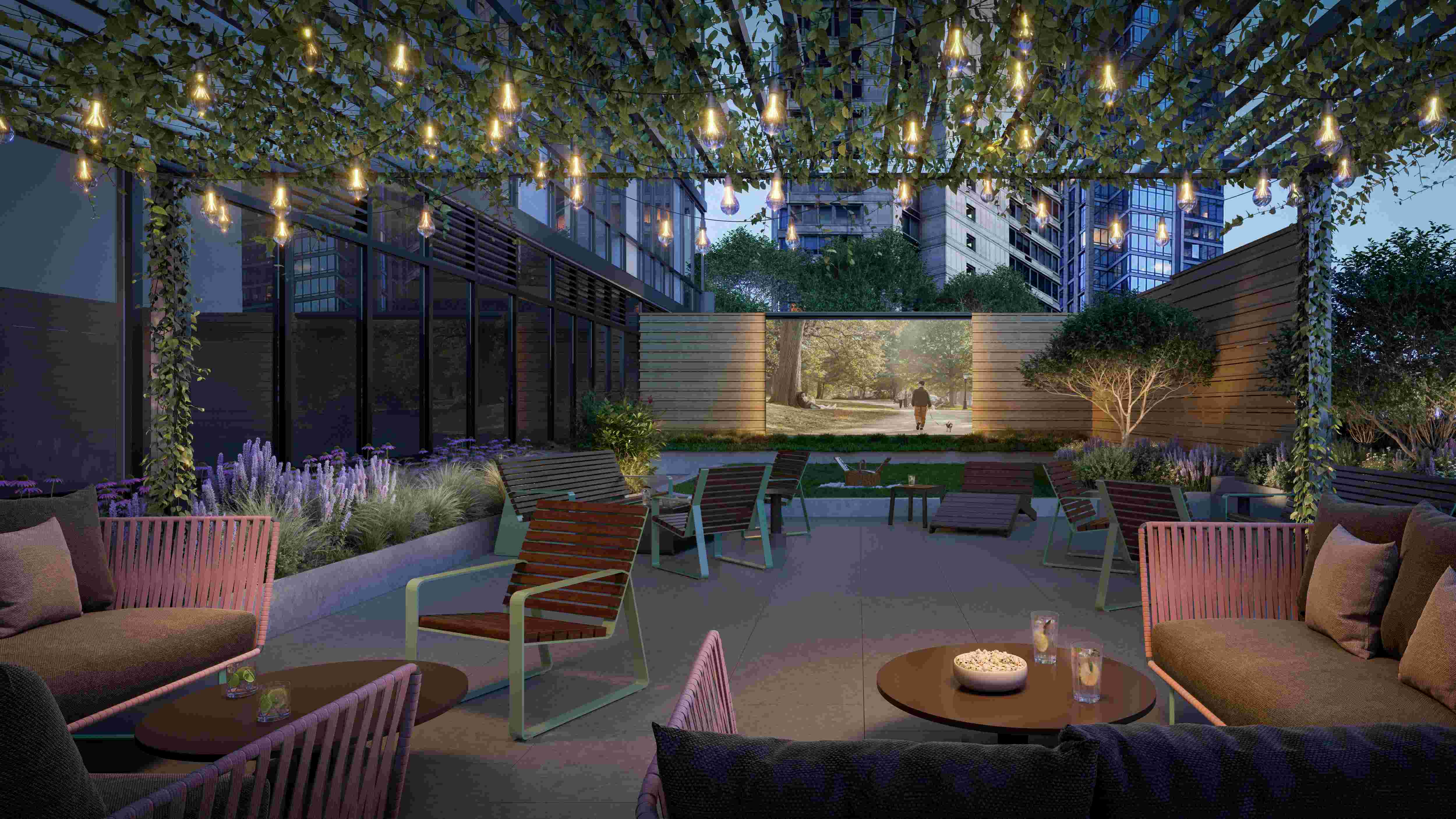 Developed by Rockrose Development and designed by SLCE Architects, the building boasts a wide range of amenities, including an outdoor pool and sundeck with a hot tub, a game room with bocce and foosball, a golf and multi-sport simulator, a dog park, wine and party room, a gym, and yoga studio. The listing says some of the amenities are still under construction and a $150 per month fee applies to use them. The gym can be used for $85 a month.