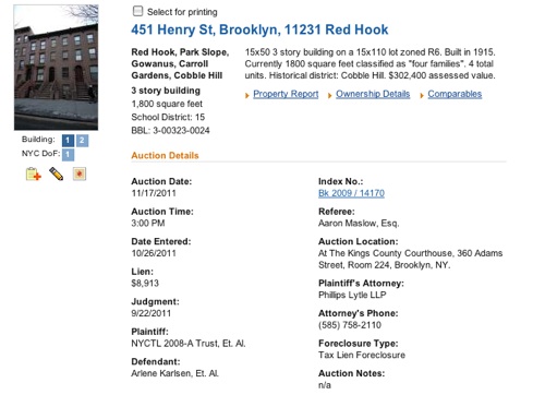 A very narrow brownstone on Henry Street in a killer location, between Kane and Degraw, is scheduled to go up for auction next month. The lien for 451 Henry comes in at a modest $8,913, but it appears the home is broken up into four rental units that are currently occupied. Of interest: The owner also owns the Rat Squirrel House at 149 Kane Street, the long-dilapidated property that’s currently being renovated. Anyone know the state of the interior at 451 Henry? More details about the auction after the jump. GMAP