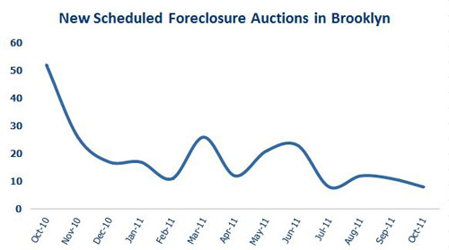 PropertyShark’s latest report on foreclosures is showing the same trend the data company has been reporting for the past several months: The number of newly scheduled auctions in Brooklyn continues to drop. There were only eight first-time foreclosure auctions scheduled last month, which is down 85 percent from last year. There was also a citywide decrease of 6 percent year-over-year, and this is the fifth consecutive month in which foreclosures have dropped. The question continues to be whether these numbers represent a healthier local housing market or a lull before the other shoe drops. Last month Property Shark Founder Matthew Haines offered the opinion that the decline we’ve been seeing “is due to increased legal pressure” and that as “we enter a new recession, we expect homeowners to continue to have trouble making payments on mortgages that continue to far exceed the value of the underlying houses.”